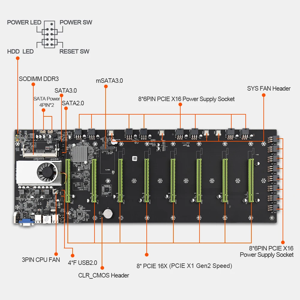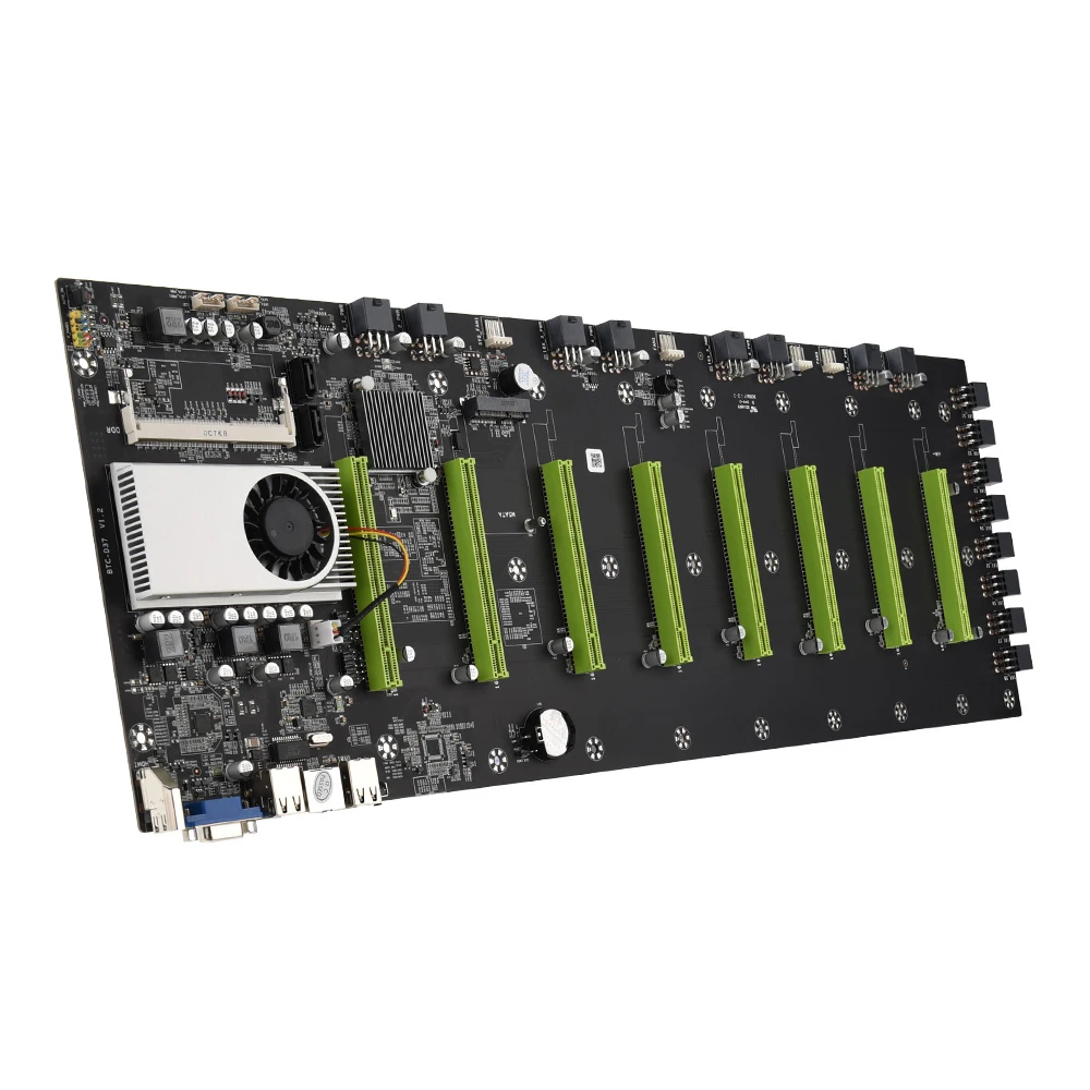 Особенности:1. Слот для памяти, 8 разъемов для видеокарты2. Стабилизирующий конденсатор напряжения может обеспечить стабильное напряжение для вашего оборудования питания3. Он может обеспечить тихую производительность, низкое энергопотребление, меньшее количество тепла, энергосбережение и безопасное использованиеСпецификация:Модель: BTC-D37Память: 1 * DDR3 Sodimm слот, поддержка 1066/1333/1600 МГцХранение: 1 * SATA3.0 + 1 * SATA2.0 + 1 * m SATA2.0USB: 4 * USB2.0Сетевой порт: гигабитный сетевой порт RJ45Расширяемый порт: 8 * PCIE 16X,16*6pin PCIE X16 разъем питания, HD + VGAЦвет: черный + зеленыйУпаковочный лист:1 * материнская плата BTC Mining