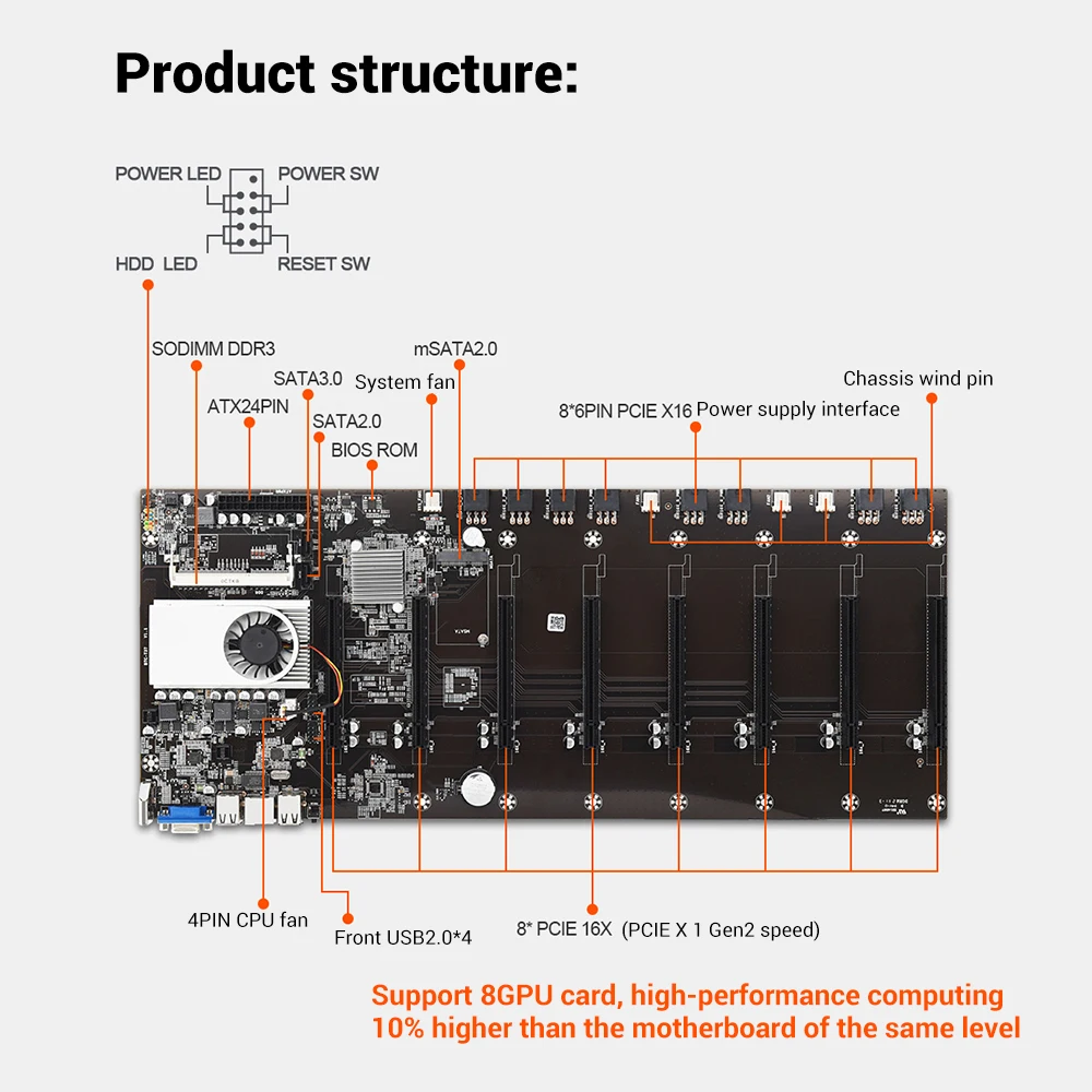 Расширяемый порт: 8 * PCIE 16X,8*6pin PCIE X16 разъем питания, HDMI-совместимый + VGA