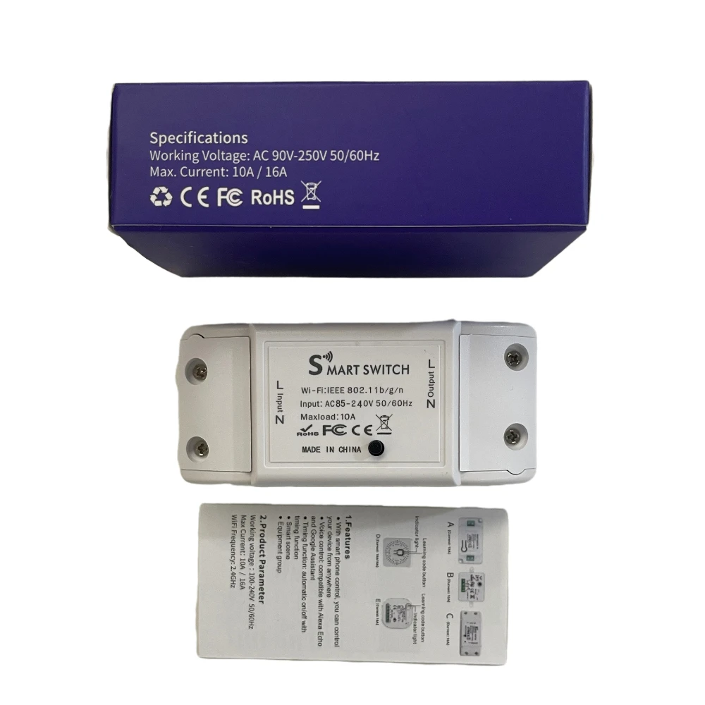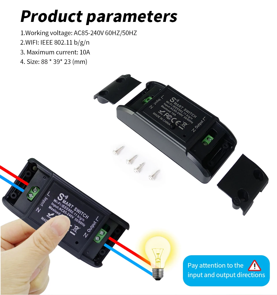 Название продукта: переключатель Wi-Fi 10AРазмер: 88*39*23 ммНоминальный ток: 10AНоминальное напряжение: AC85-240V 50/60 Гц, 110 В, 220 ВНоминальная мощность: 2200 ВтРекомендуемая мощность (безопасность) : 2000 ВтПротокол связи: WiFi 2,4G