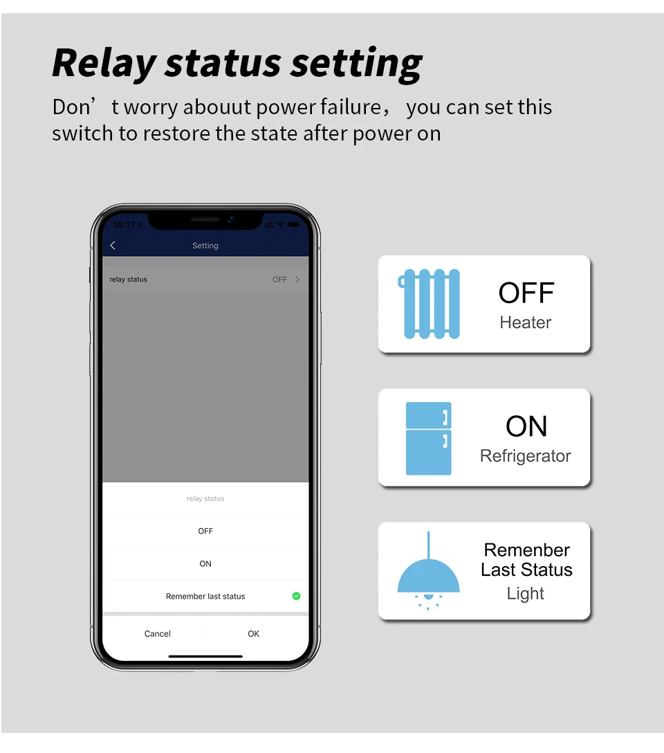 Не беспокойтесь о сбое питания, вы можете установить этот переключатель, чтобы восстановить состояние после включения питания.