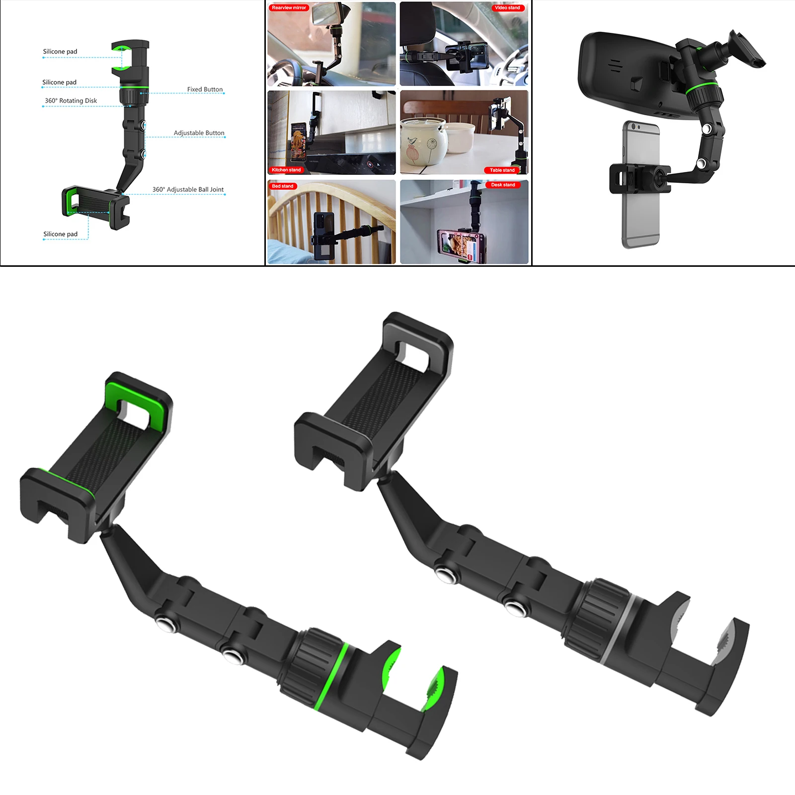 Многофункциональность: Автомобильный кронштейн для зеркала заднего вида, это также артефакт в задней части автомобиля, чтобы обговорить ребенка, научиться готовить на кухне, собирать за столом.Простота установки: конструкция с большим шагом, Быстрая блокировка, экономия времени и усилийБольшой размер: подходит для большинства мобильных телефонов на рынке, и позволяет вам зажимать его там, где вы хотите.Супер гибкий, 960 ° вращение по желанию, дает вам искренний уголУльтра-стабильная: металлическая краска нажимает вращающуюся кнопку, которая удобна и быстра, устойчива и не трясется