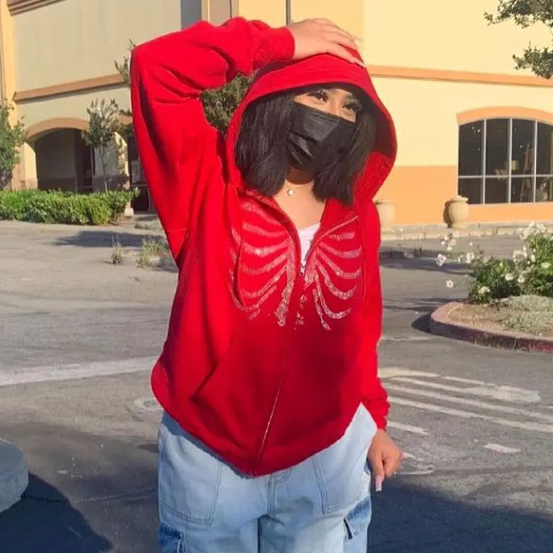 Y2K Стразы худи Скелет женские готические гранж на молнии оверсайз ...