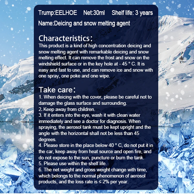 3. 100% безопасная формула: многофункциональная машина для удаления снега-это высококонцентрированное средство для высыхания и таяния снега, которое имеет значительный эффект высыхания и таяния снега. Краска не будет повреждена, стекло не будет повреждено, и слайсер полностью безопасен. И чтобы предотвратить повторное замораживание расплавленного льда при низких температурах.