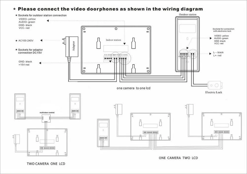 Это 4-проводная система, мы предоставим 4 основных разъема в посылка, вам нужно использовать 4-ядерный кабель для подключения. Пожалуйста, обратитесь к проводке ниже.(Пожалуйста, обратите внимание, что электронный замок на фото ниже не включен, если вам нужно, пожалуйста, свяжитесь с нами)