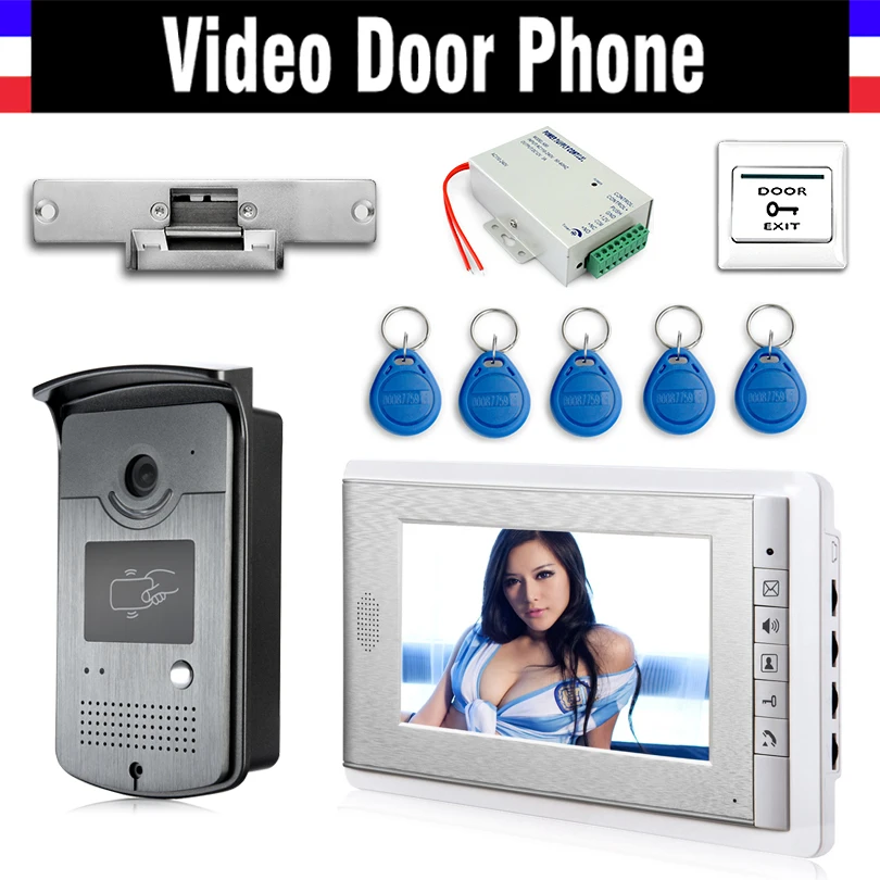 Видеодомофон с цветным экраном 7 дюймов, система связи с RFID-идентификацией, камера контроля доступа, электрический замок удар, источник питания, выход на дверь