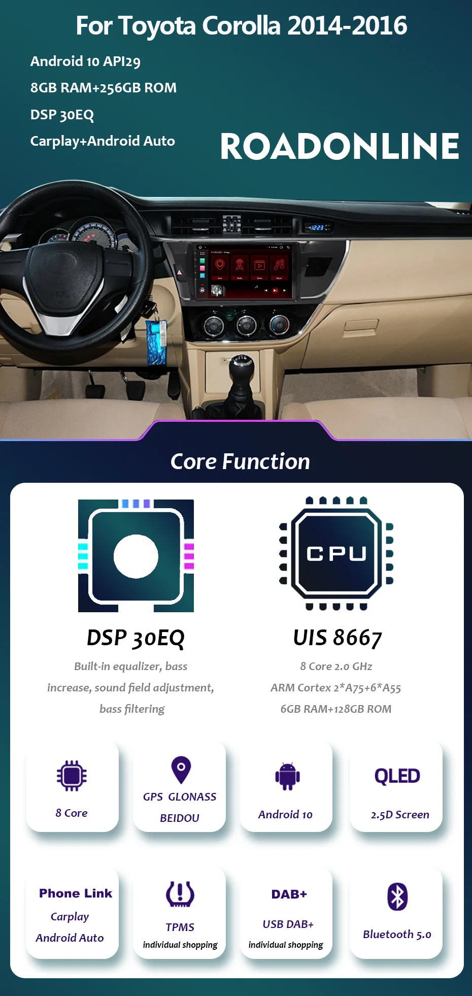 Автомобильный радиоприемник 8 + 256 ГБ Android 10 для Toyota Corolla 2014-2016 8 + 256G 4G Wifi мультимедийное видео RDS DSP плеер GPS навигация