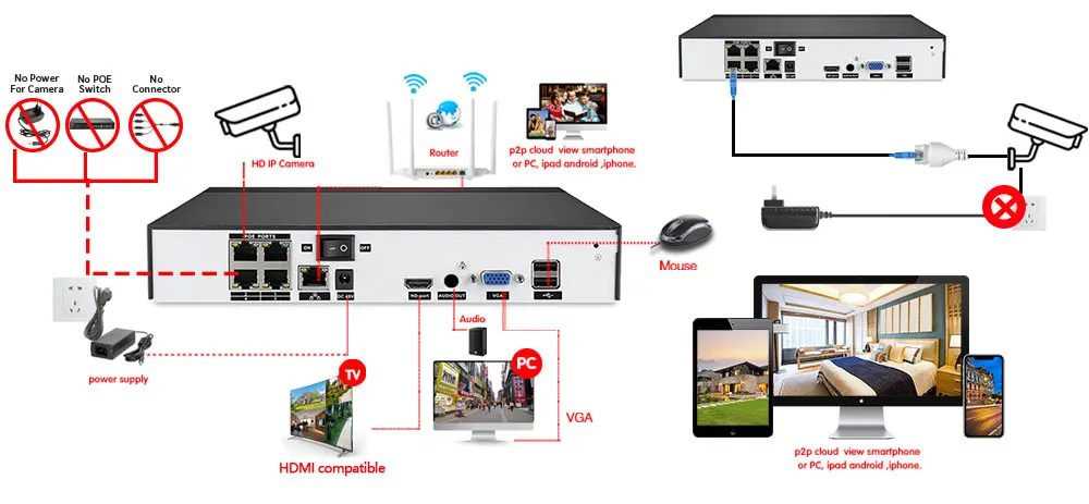 Нет дополнительных кабелей питания или адаптеров, просто подключив ip-камеру к NVR с помощью одного кабеля, вы можете легко завершить установку без знания о компьютере или сети и начать наслаждаться супер простым мониторингом среди вашего смартфона, планшета или ПК.Экономьте деньги и удобный POE NVR = NVR + POE коммутатор, подключи и работай и простая настройка!