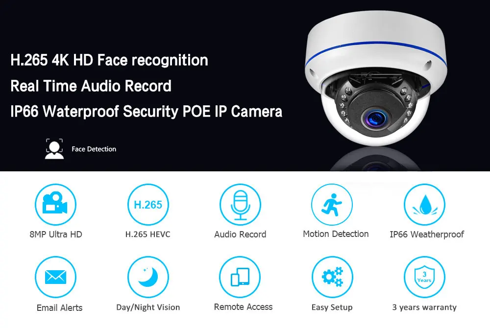 1, Ультра HD 4K дисплей высокой четкости, расширенное H.265 Сжатие видео;2. Ультра HD 4K POE ip-камера, металлический материал, IP66 водонепроницаемый, подходит для внутреннего и наружного использования, надежная Домашняя безопасность;3. Поддержка питания через Ethernet, подключи и работай, простота установки;4. Поддержка распознавания лица, записи лица, воспроизведения лица, обеспечивает ультра высокое разрешение видео наблюдения, обеспечивая максимальную детализацию и четкость доступны;5. Поддержка аудиозаписи, все камеры встроены в микрофон;6. Поддержка Ultra HD дневного ночного видения;7. Поддержка IR-CUT переключателя двойного фильтра, днем и ночью для достижения мониторинга, цвет не является частичным искажением цвета;8. Поддержка обнаружения движения, оповещения по электронной почте, воспроизведения видео и многоязычности;9. Поддержка Android,Iphone,Ipad,PC,VMS,P2P view;10. Удаленный доступ в любом месте, в любое время;