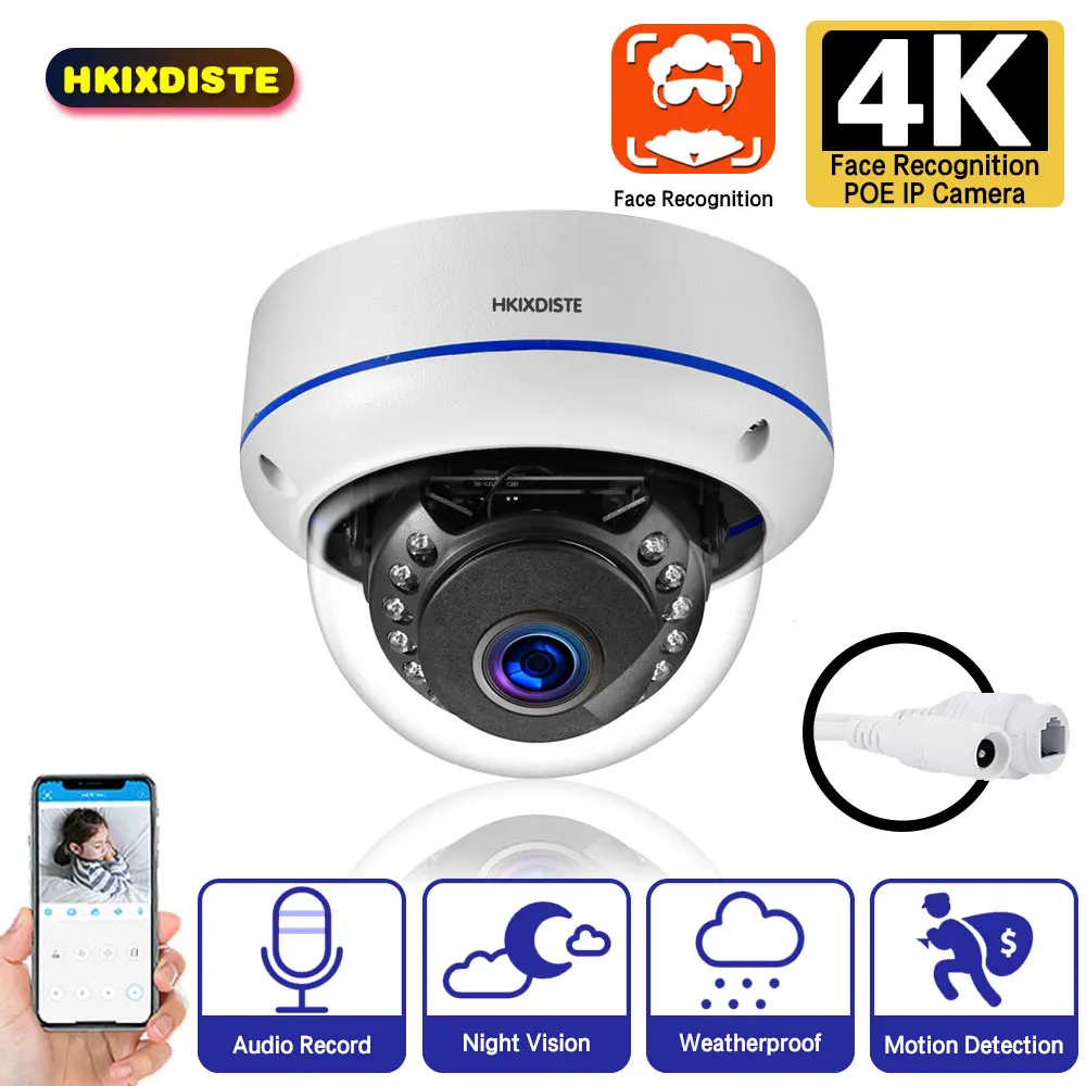 Купольная IP-камера с функцией распознавания лица, 4K POE, 8 Мп, водонепроницаемая уличная камера с датчиком движения для домашней и комнатной безопасности