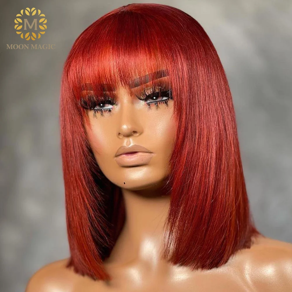Красный короткий парик Боб с челкой, цветные парики на сетке спереди, человеческие волосы 250, парик на сетке высокой плотности, полные бразильские парики для чернокожих женщин