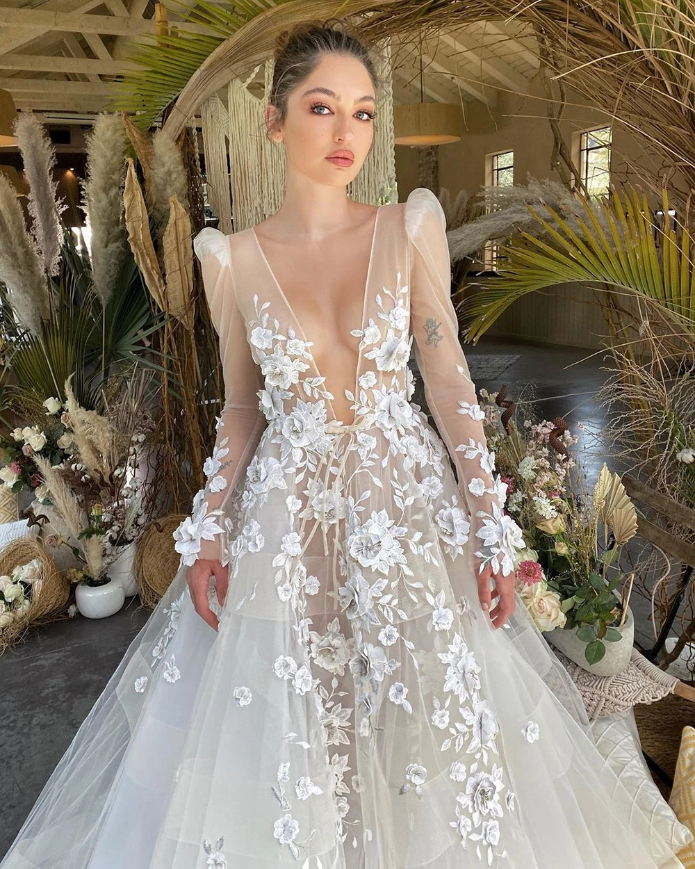 Женское свадебное платье It's yiiya, белое кружевное платье А-силуэта с 3D цветами, V-образным вырезом и длинными рукавами на лето 2019