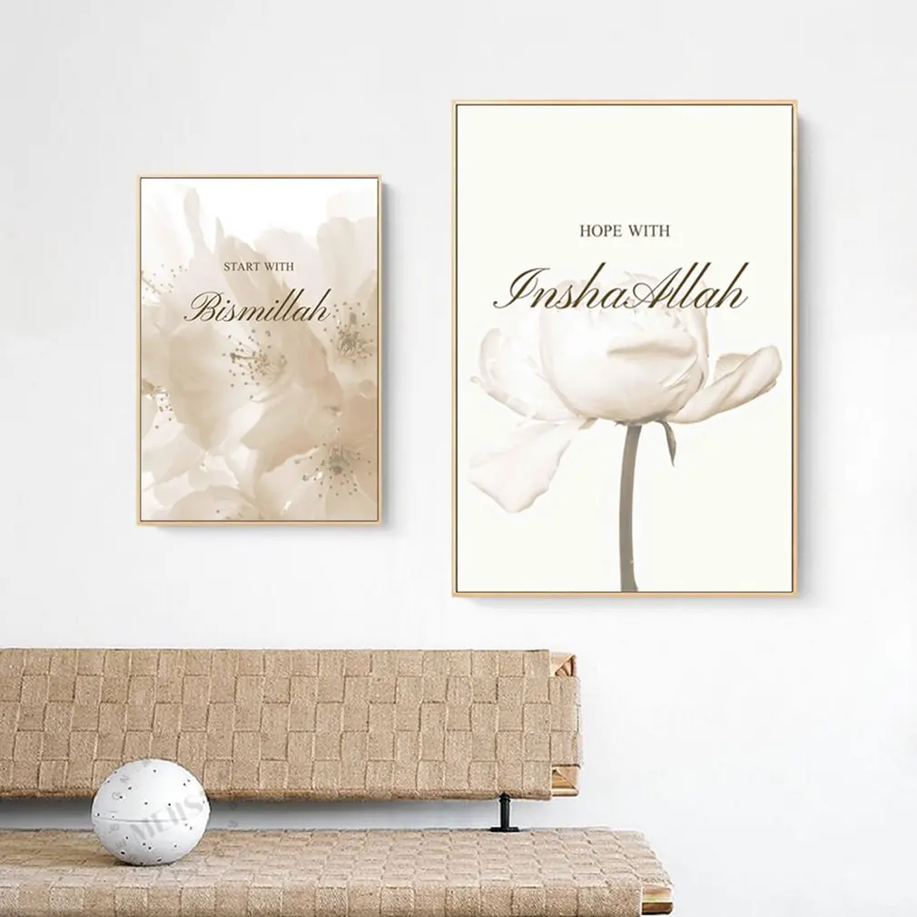Настенная картина с изображением бежевого пиона на холсте, художественный плакат в исламском стиле, каллиграфия в богемном стиле, декоративная картина, мусульманское украшение для дома