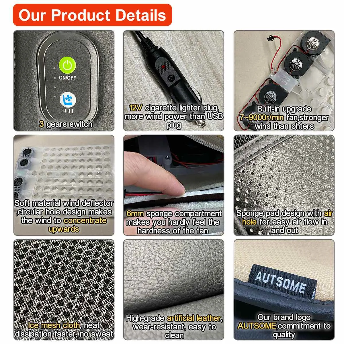 Особенности:-С 4 встроенными вентиляторами и 3 скоростями-40-50bd Супер тихий дизайн-Нескользящая подошва и ремни-эта охлаждающая Подушка сиденья имеет нескользящее резиновое дно и регулируемые ремни, чтобы закрепить ее на автомобильное сиденье-Не влияет на использование подушки безопасности-Дышащие слои дизайна-специальные вентилируемые и охлаждающие слои решает проблему, что вентиляционные отверстия блокируются человеческим телом по сравнению с обычным охлаждающим сиденьем для эффективного устранения горячих липких сидений. Сетчатая Ткань 3D обеспечивает отличную поддержку и функцию вентиляции, чтобы сохранить тепло вашего тела от вашего сиденья.Приспособление:Универсальная посадка-этот чехол для охлаждающего сиденья имеет универсальный размер и подходит для большинства сидений или стульев транспортного средства. Он подходит для автомобиля 12V автомобиль, грузовик, MPV Субару Outback, автобус или лодки.(Работает только в прикуривателе 12 В или адаптере переменного тока.)