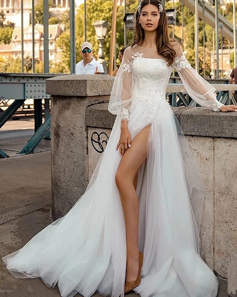 Женское свадебное платье It's yiiya, элегантное фатиновое платье-трапеция с длинными рукавами-фонариками и кружевной аппликацией на лето 2021