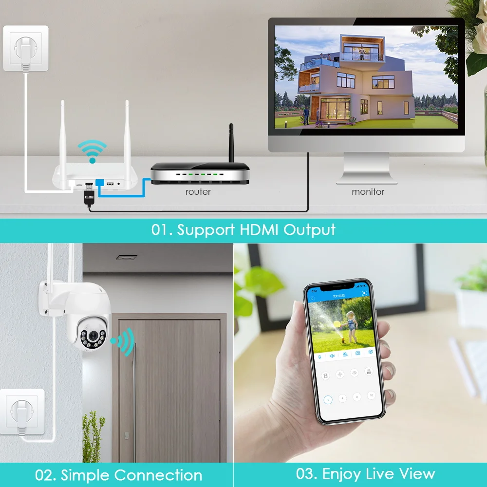 Просто Подключите камеру и NVR к источнику питания, и подключите NVR к роутеру для использования, что очень удобно