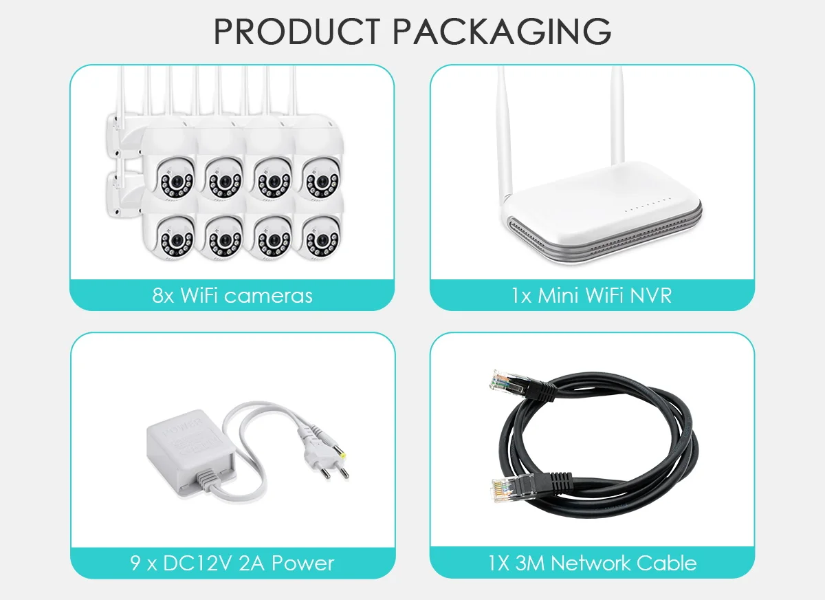 8x PTZ камеры (3MP);1х Мини WiFi NVR(8CH);9x12V источник питания;1x Руководство пользователя;1x сетевой кабель 3 м;