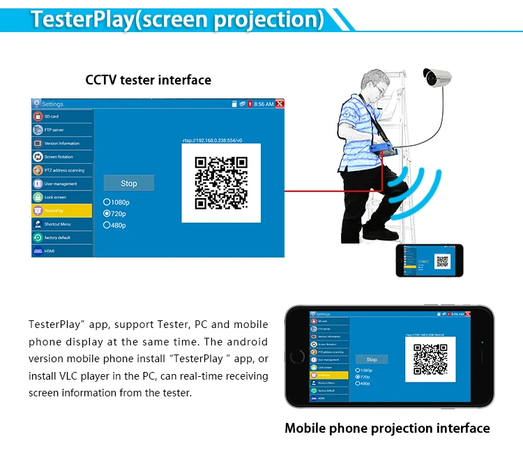● Воспроизведение тестера: тестер, мобильный телефон версии android и дисплей ПК одновременно