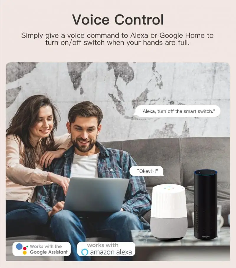 Поддержка голосовых помощников, таких как Tmall Genie, Alexa, Google Home и т. д., для достижения таких функций, как переключатели; «Alexa, включите Кухонные светильники». Включите свет в одном предложении и наслаждайтесь удобной умной жизнью.