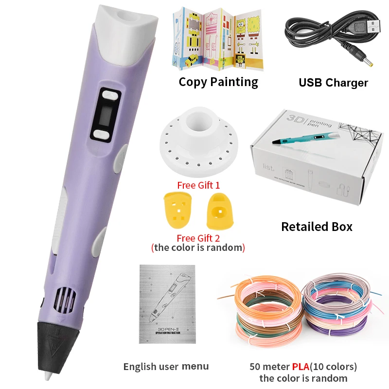 1 x 3D Ручка1 х USB кабель1 х Руководство по эксплуатации1 x шаблон для рисования1 x цветная PLA
