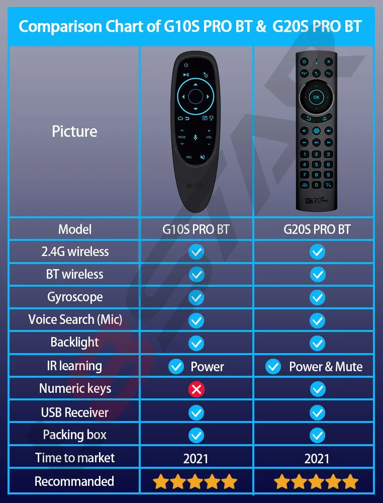 Есть 2 версии (G10S Pro BT/G20S Pro BT) для вашего выбора, перед заказом, пожалуйста, проверьте эту таблицу функций и выберите правильную версию.