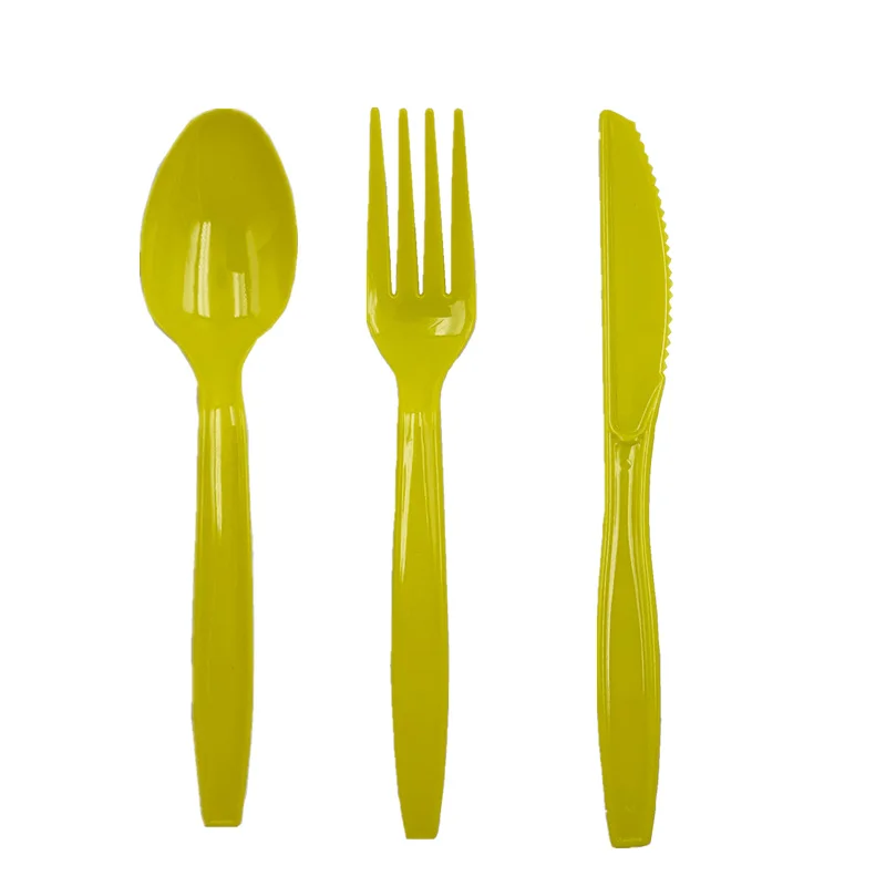 Набор пластиковых однотонных ножей, вилок, ложек, желтого, синего, ...
