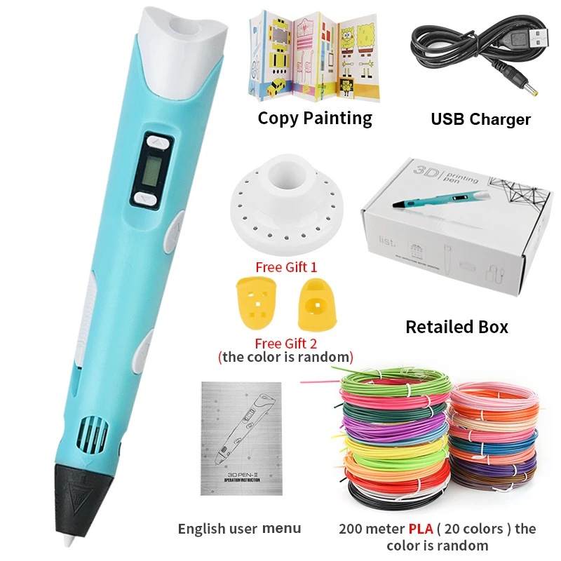 1 x 3D Ручка1 х USB кабель1 х Руководство по эксплуатации1 x шаблон для рисования1 x цветная PLA