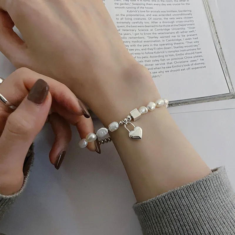 Женский браслет с бусинами MEYRROYU, элегантный корейский браслет из стерлингового серебра с натуральным жемчугом и кулоном в виде любовного замка, бижутерия, подарок на день рождения