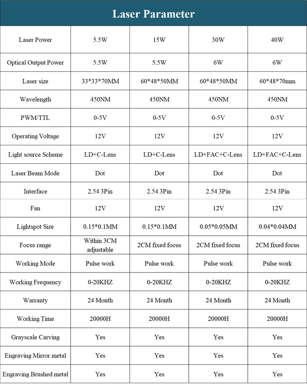 --5500 МВт: фактическая Выходная мощность: 5500 МВт (Lightspot Размеры: 0,15*0,1 мм)--15 Вт: фактическая Выходная мощность: 5 Вт (Lightspot Размеры: 0,15*0,1 мм)--30 Вт: фактическая Выходная мощность: 6 Вт(Lightspot Размеры: 0,05*0,05 мм)--40 Вт: фактическая Выходная мощность: 6 Вт(Размер светового пятна: 0,04*0,04 мм)