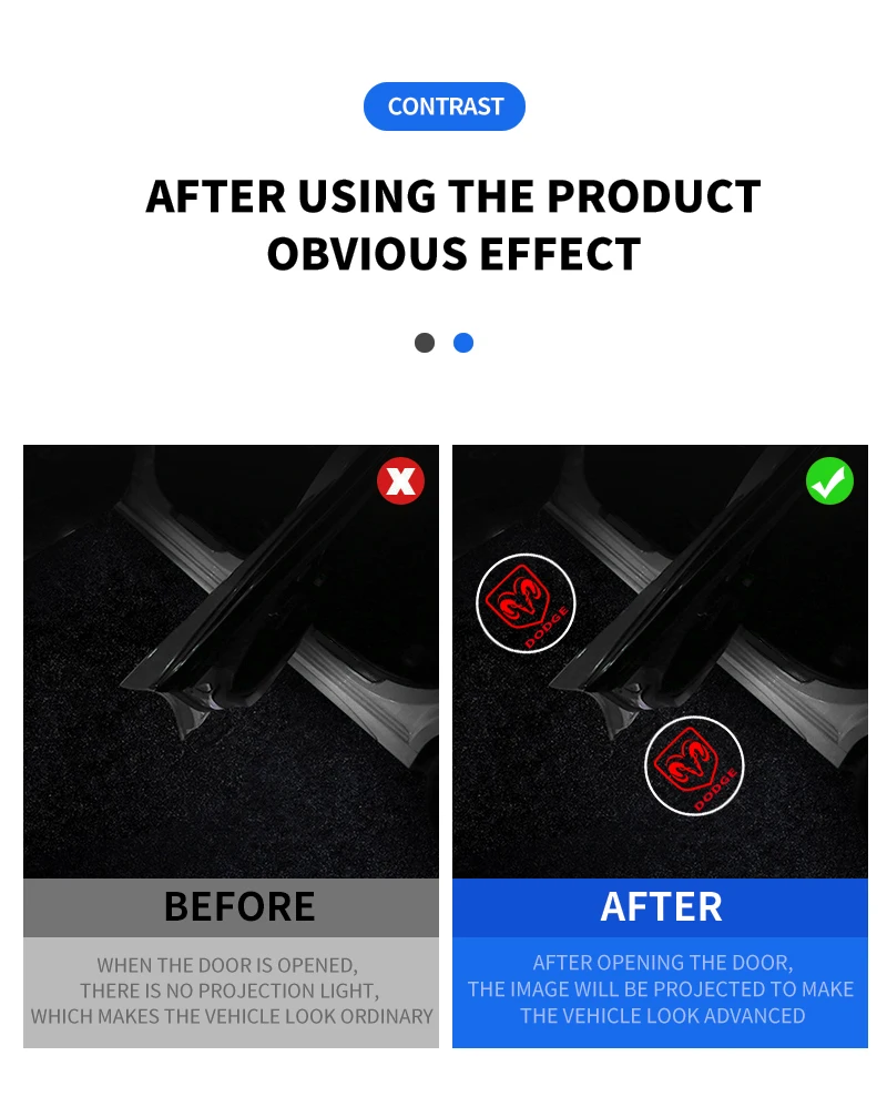 2. Умный светильник. Ослепляющий светильник с логотипом и сигнальный светильник будут отображаться на земле, когда вы откроете дверь автомобиля, и он выключится, когда вы закроете дверь.