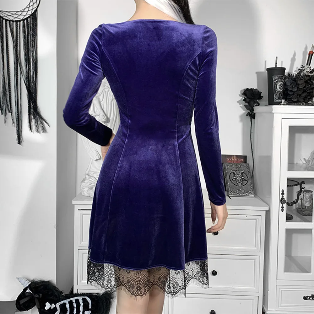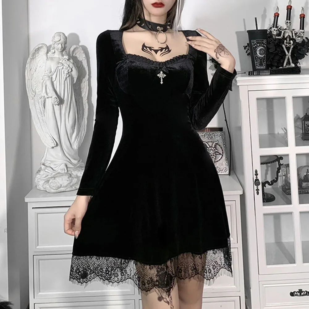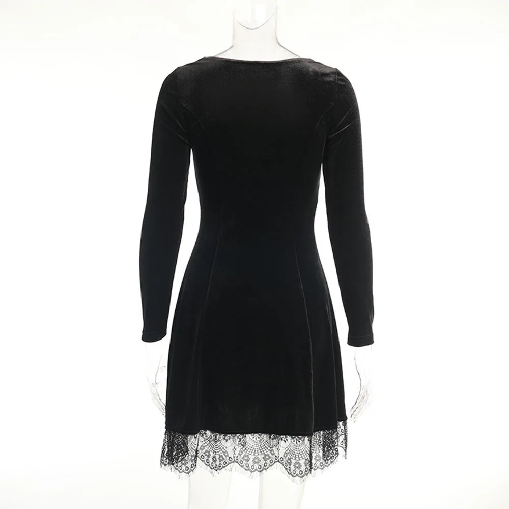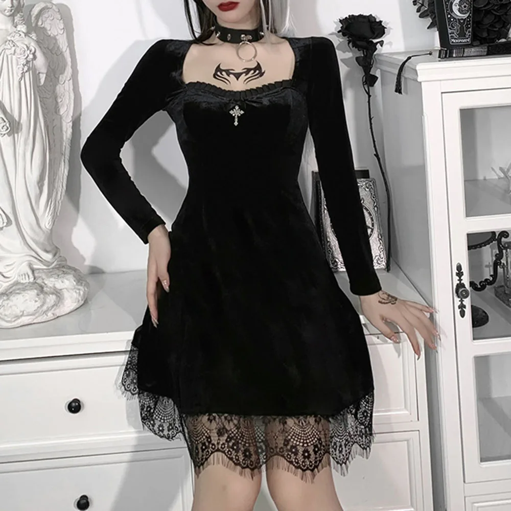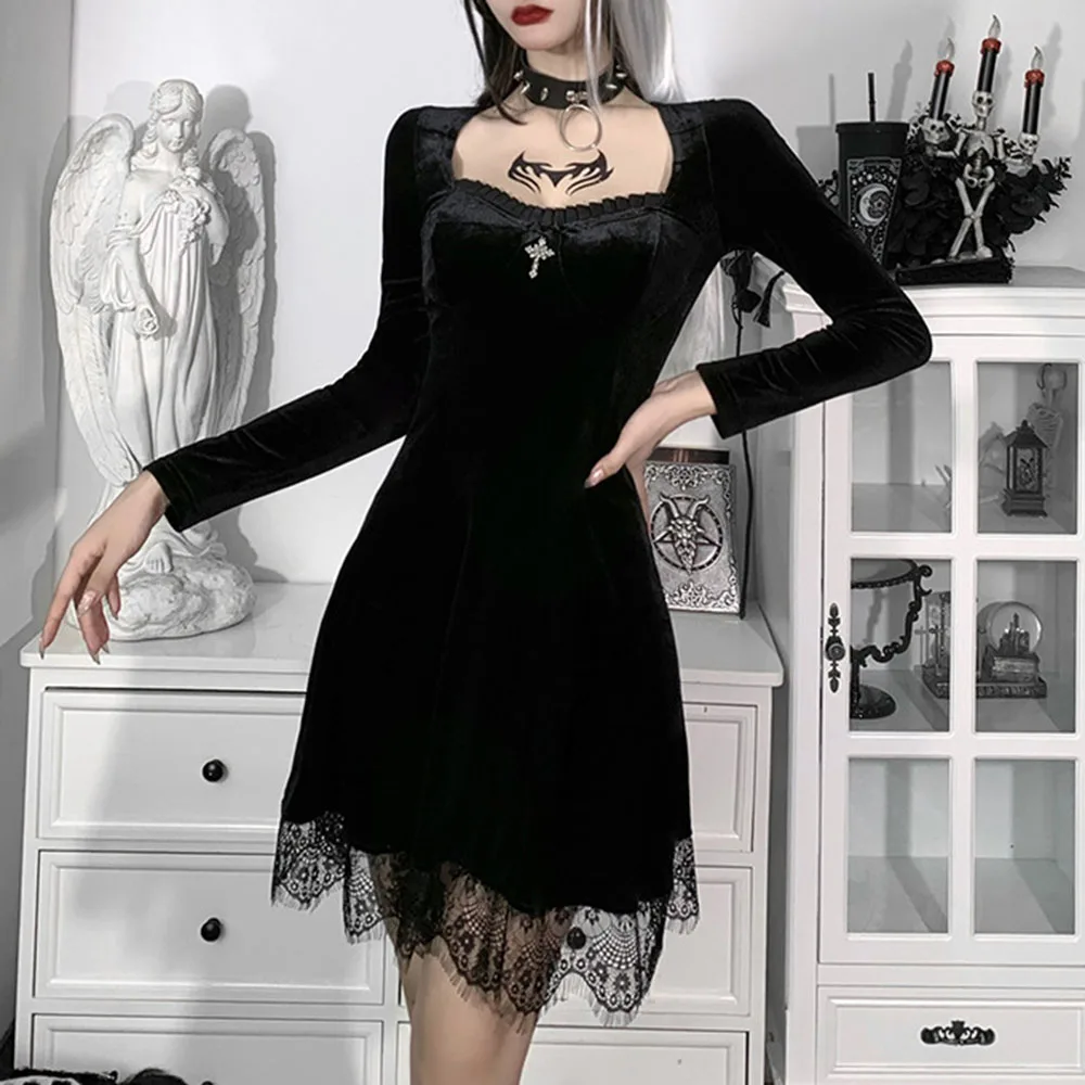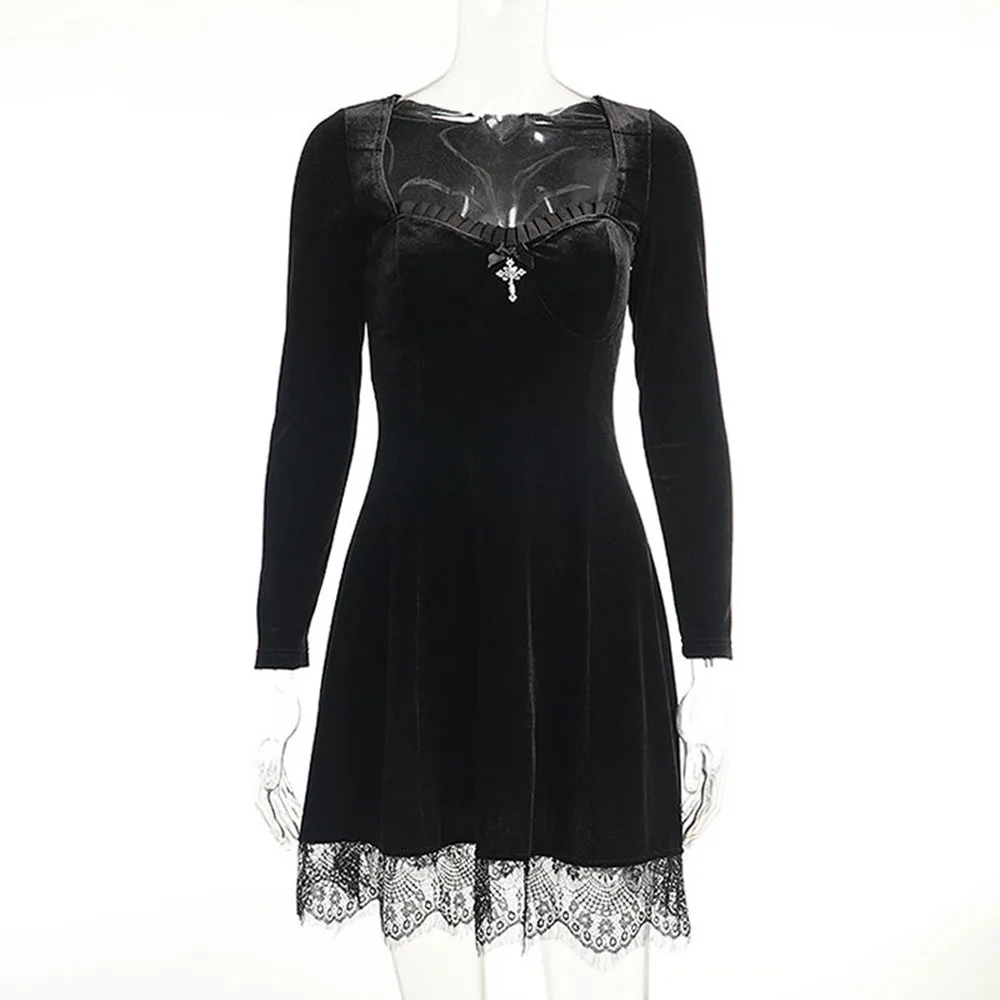 Женское короткое платье с длинным рукавом, кружевное бархатное платье мини с квадратным вырезом, повседневная одежда для вечеринок, весна 2022
