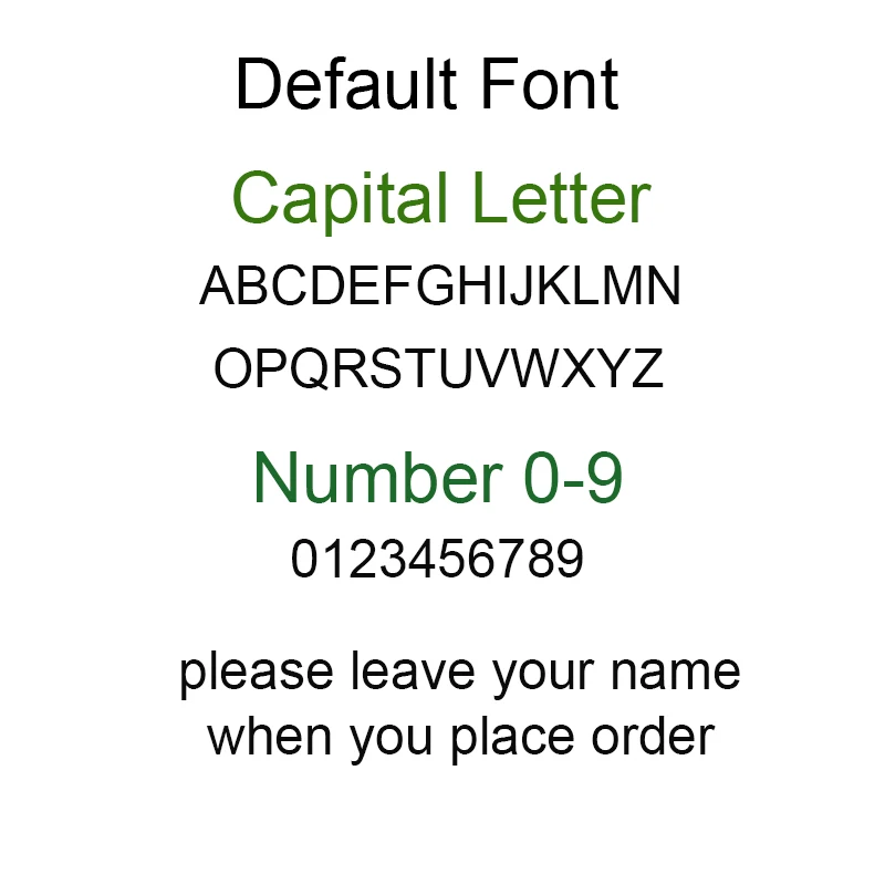 1. Дорогой, после того, как вы разместили заказ. Пожалуйста, пришлите нам имя, которое вы хотите настроить. И выберите тип шрифта, который вам нравится. (Например:Алиса, шрифт 2. ) Если вы не прислали нам понравившийся Вам шрифт, мы будем использоватьШрифт основного изображения. Надеюсь, вы понимаете