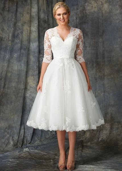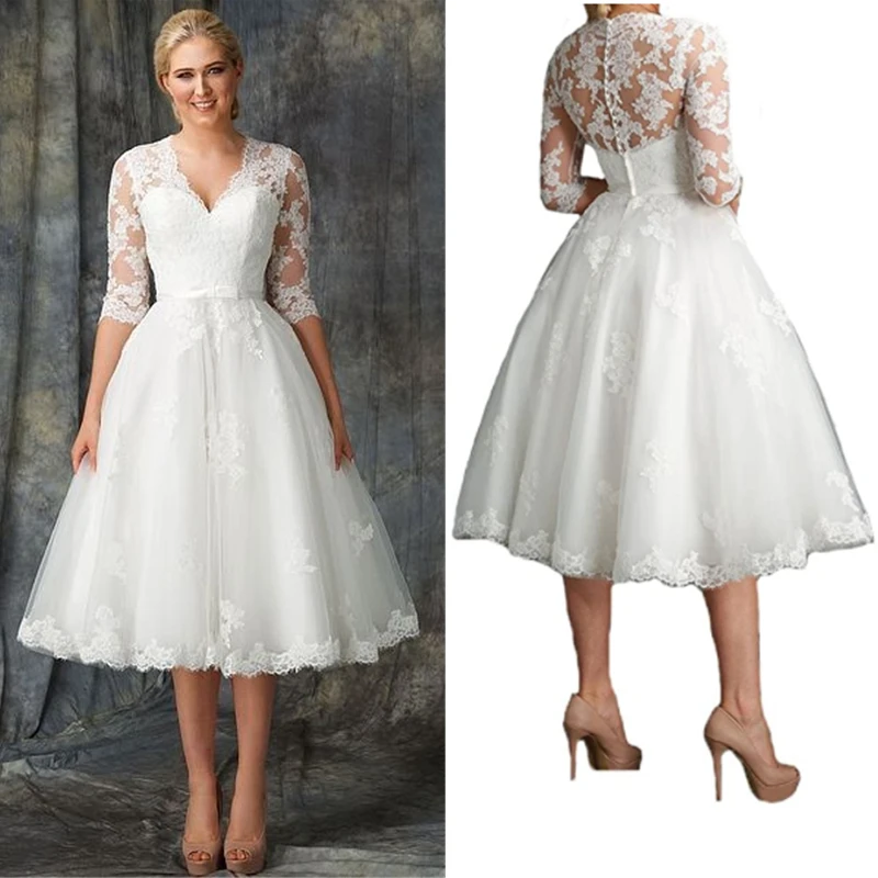 Женское свадебное платье It's yiiya, белое короткое ТРАПЕЦИЕВИДНОЕ ПЛАТЬЕ до середины икры с V-образным вырезом и рукавами до локтей на вечерние 2019