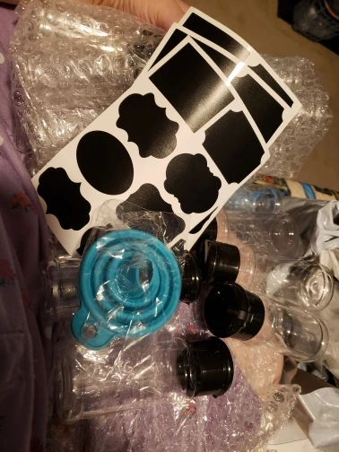 Быстрая доставка, все завернуто в пупырку. Баночки пластиковые, все-таки овепрайс немного. На 20 баночек 12 наклеек - где логика?!