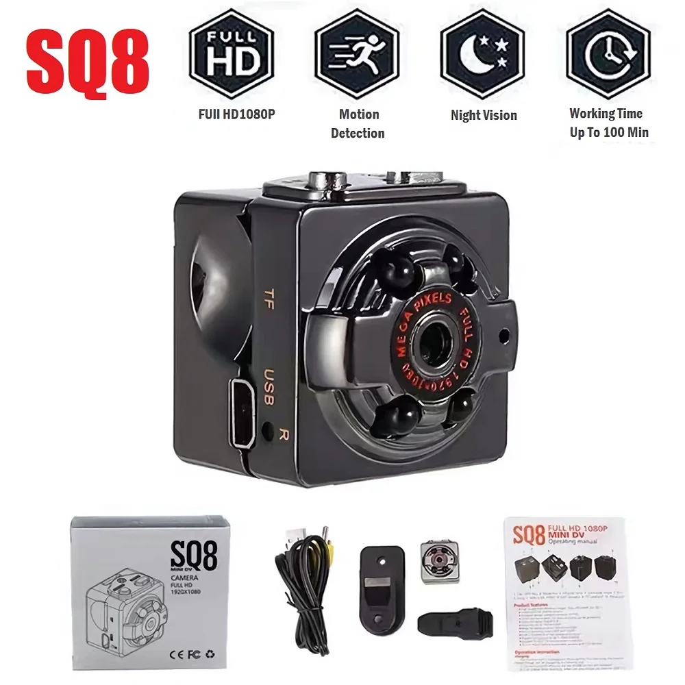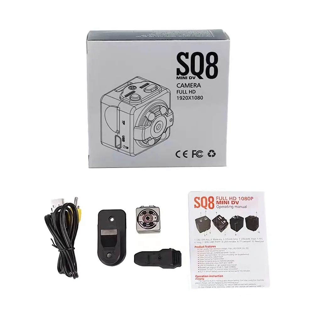 Особенности:1. Изготовлен из безопасного и прочного материала, он прочный.2. Широкоугольная съемка, большая емкость аккумулятора.3. Ночное видение усиливается, и работа может быть выполнена в темную ночь.4. Портативный DV DC.Описание:Это небольшая камера SQ8, Спортивная наружная камера, инфракрасное ночное видение, мини-камера высокой четкости.Характеристики:Цвет: черныйРазмер: 22*22*20 ммПередача: USB 2,0 mini USB TF картаБатарея: 200 мА/ч, 3,7 VОбъем памяти: TF картаФормат изображения: JPEGМатериал корпуса: металлРасширение памяти: 32GСистема поддержки: Windows me/2000/XP/Vista; Mac Os; LinuxФормат видео: AVIСрок службы батареи: 180 минТип (разрешение): 1080P; 720PПосылка включает в себя:1 x воздушная камера