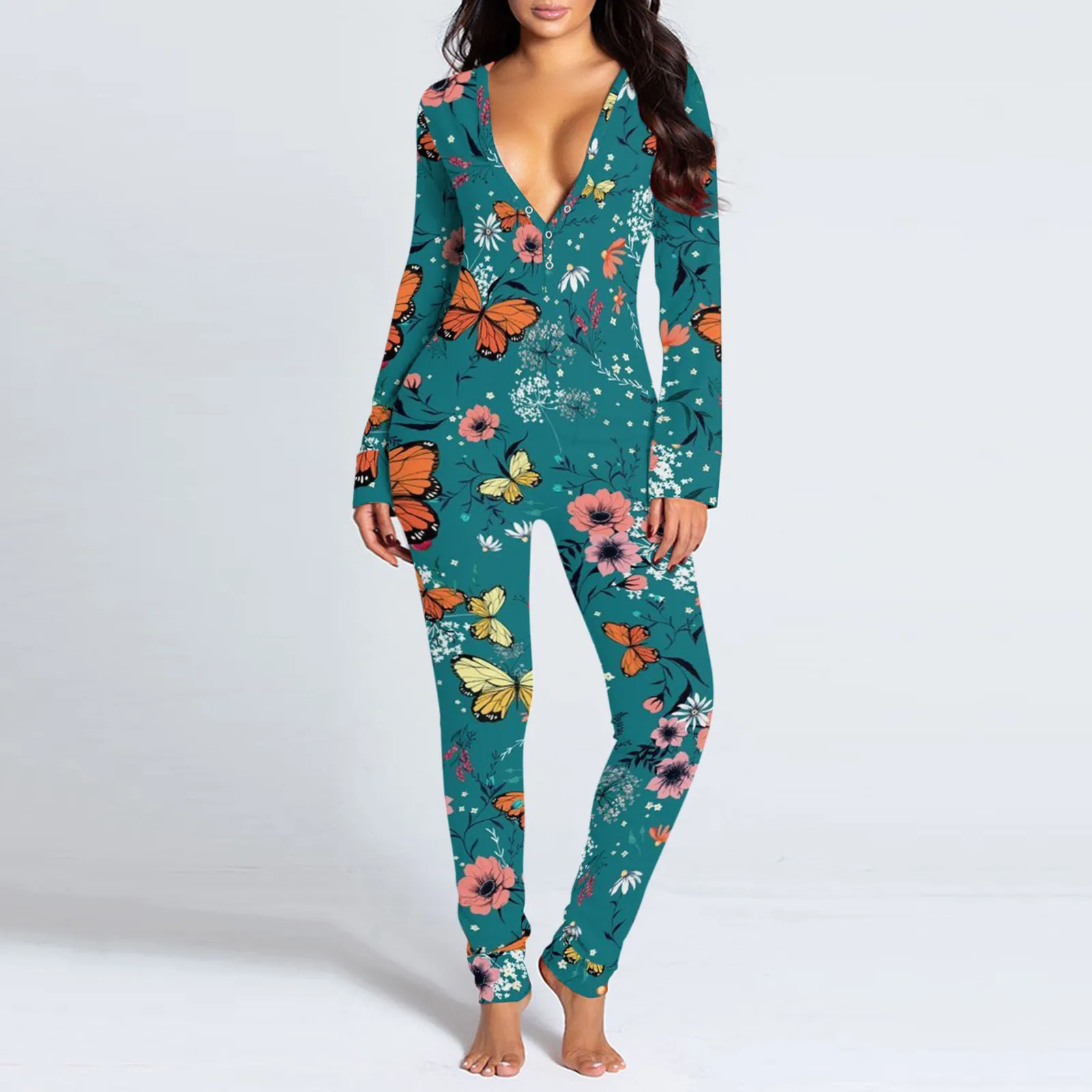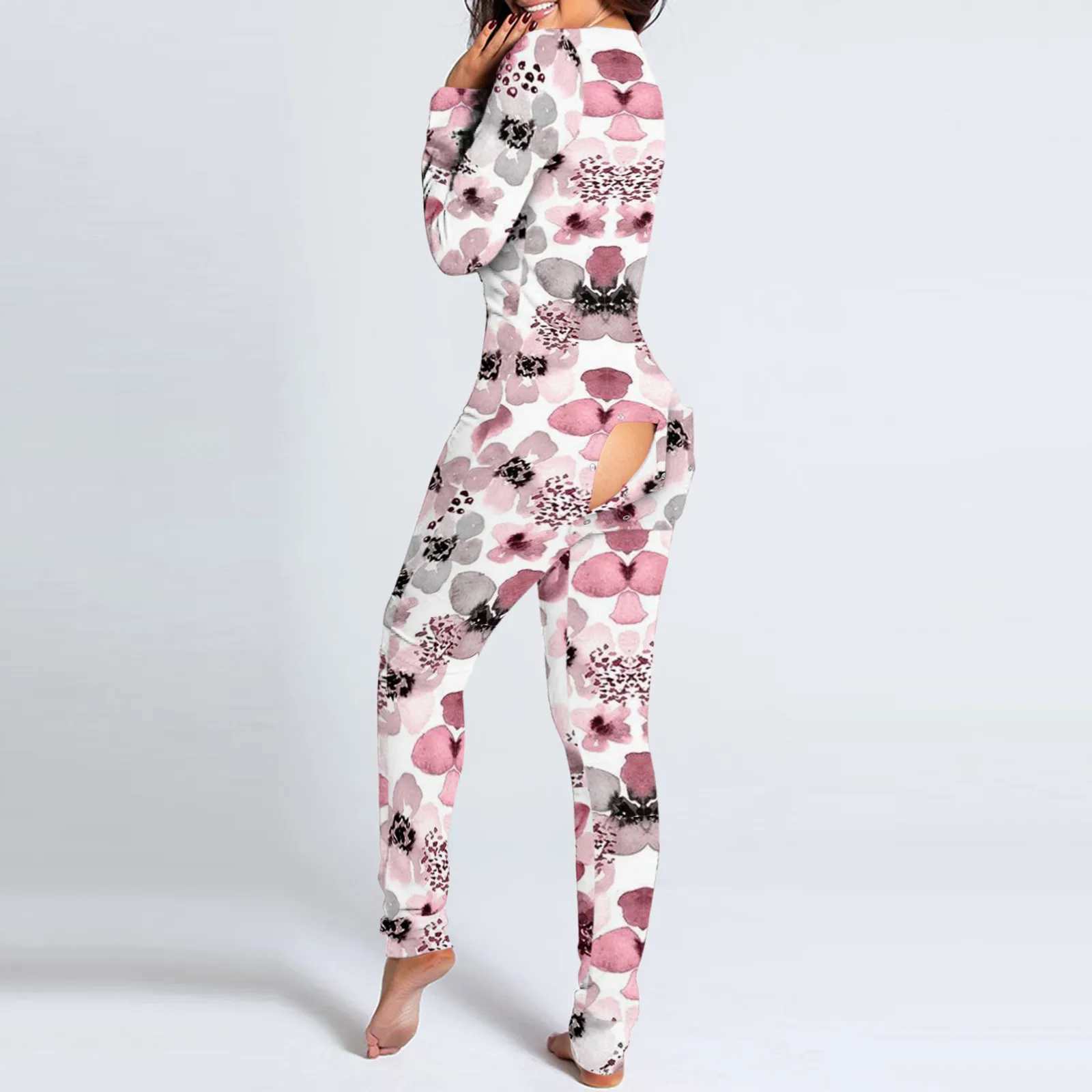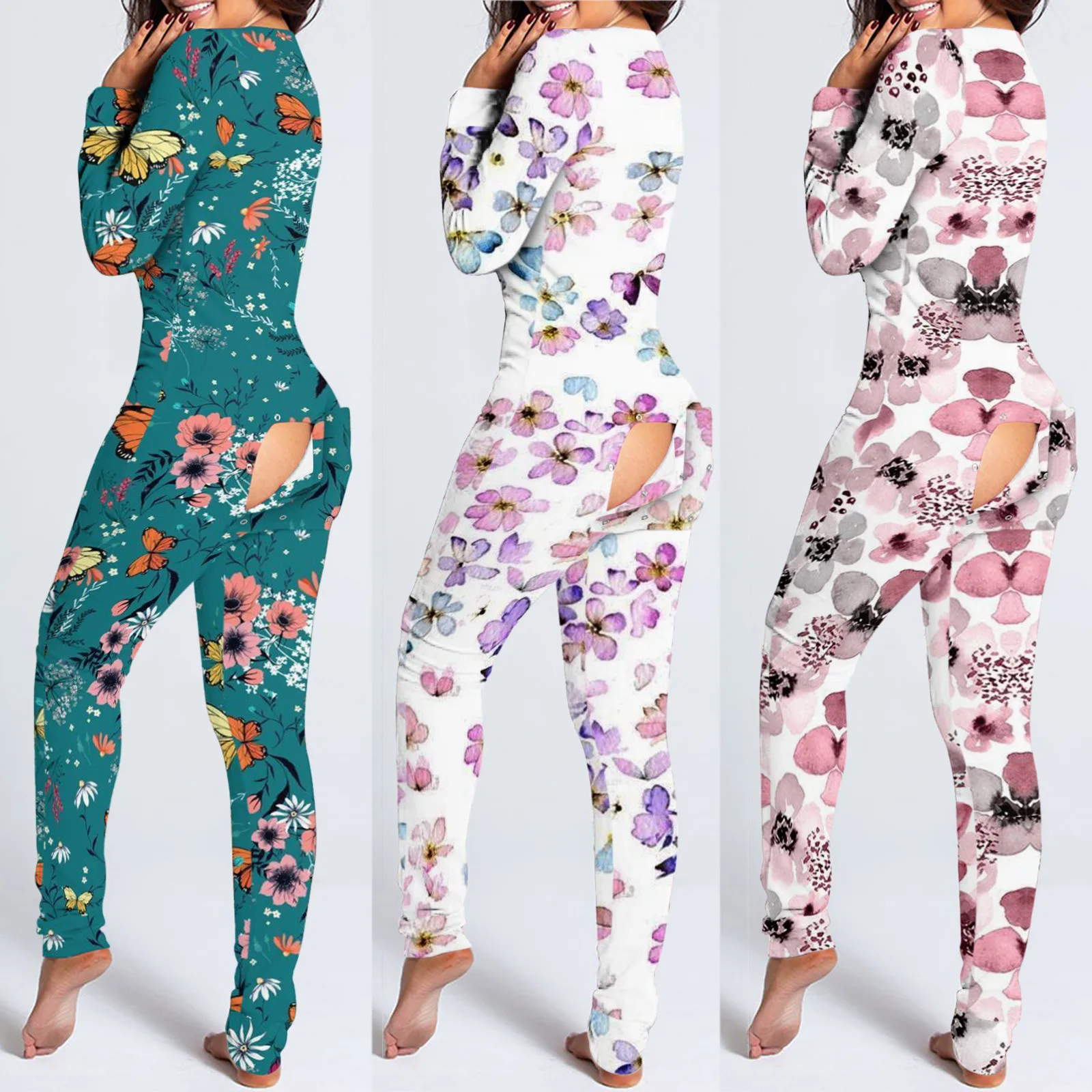 Комбинезон на пуговицах, женский комбинезон на пуговицах с цветочным принтом, Функциональная женская пижама с длинным рукавом, одежда для сна