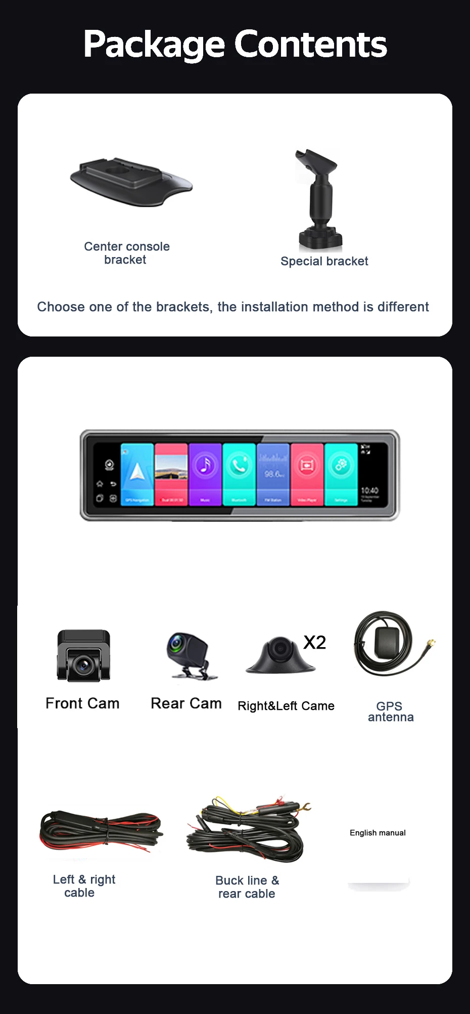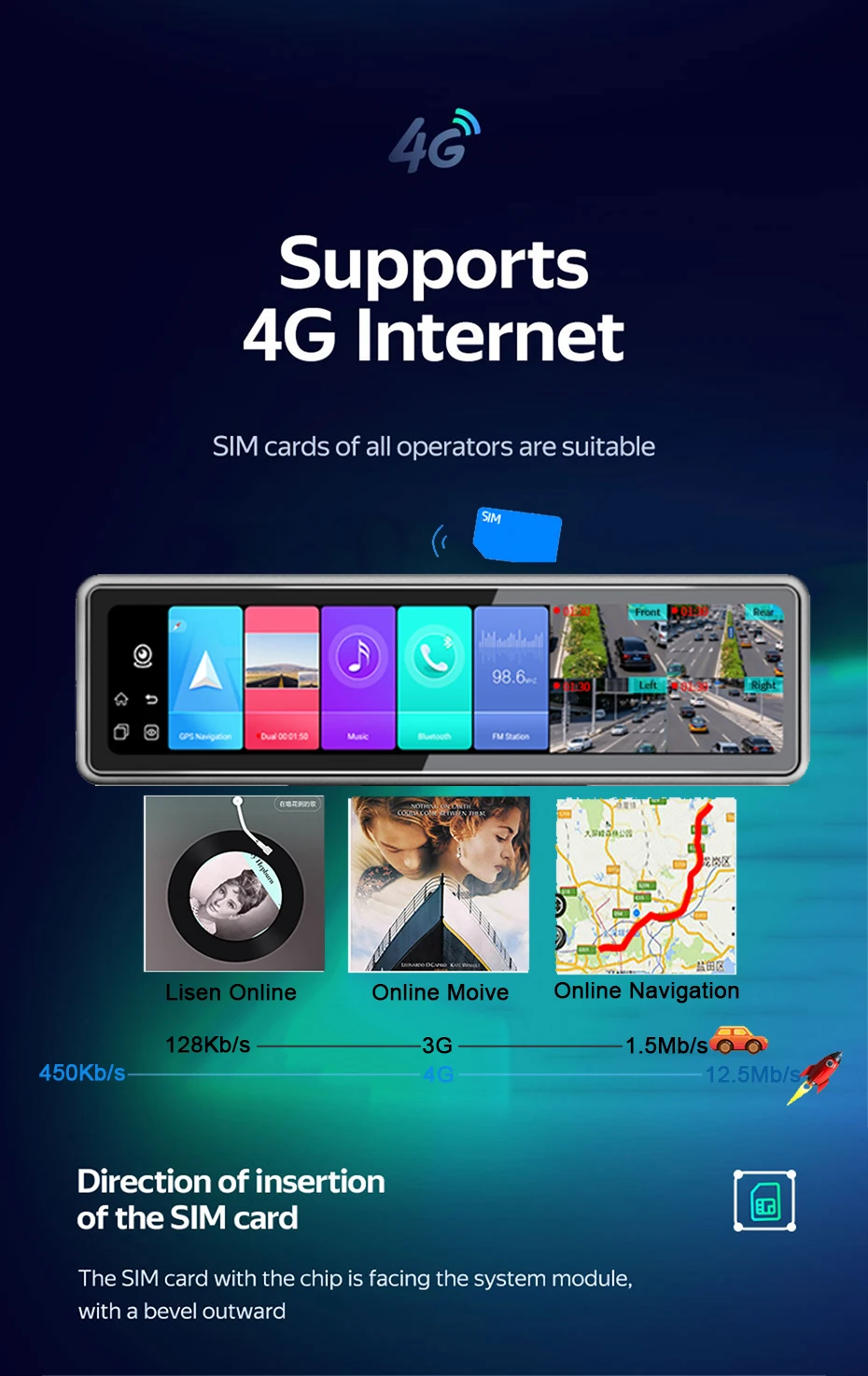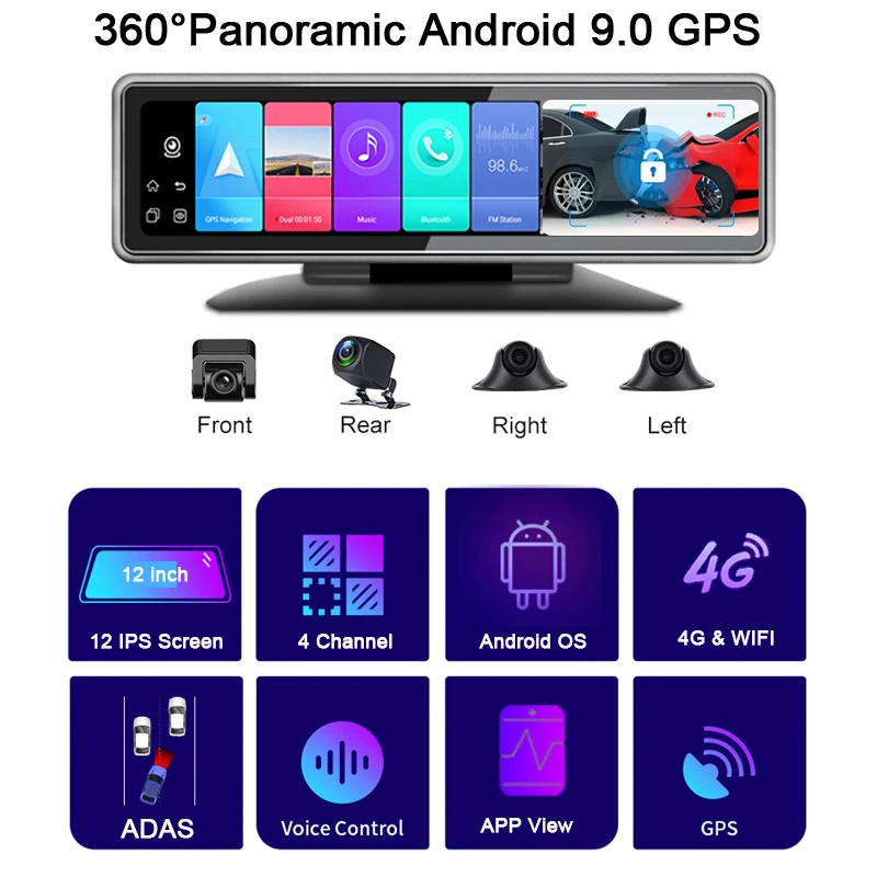 > 12 дюймов Full View сенсорный Экран> Поддержка 4 разделенных экрана в то же время> 4 канала 360 ° панорамный вид(Для безопасной парковки)Фронтальная камера: FHD 1080P,150 °-170 °Задняя камера: FHD 1080P ,140 °Левая/правая Камера: 1080P> 4G SIM & WIFI> Android 9,0> ОЗУ 2 ГБ + 32 ГБ> ADAS Plus(LDWS/ FCWS/FVMA)> Gps-навигация (бесплатное обновление карты,)> Запись Full HD 1080P> Несколько языков> Удаленный монитор в приложении «Car Assist» (поддержка ПК, веб-и мобильный телефон)> Циклическая запись> Обнаружение движения> G-сенсор> С функцией WDR / HDR> 24-часовая регистрация парковки> Голосовой помощник Google> Поддержка fm-передатчика> Bluetooth передача музыки и Bluetooth громкой связи вызова> Размер: 281*82 мм> Вес: 2,4 Кг