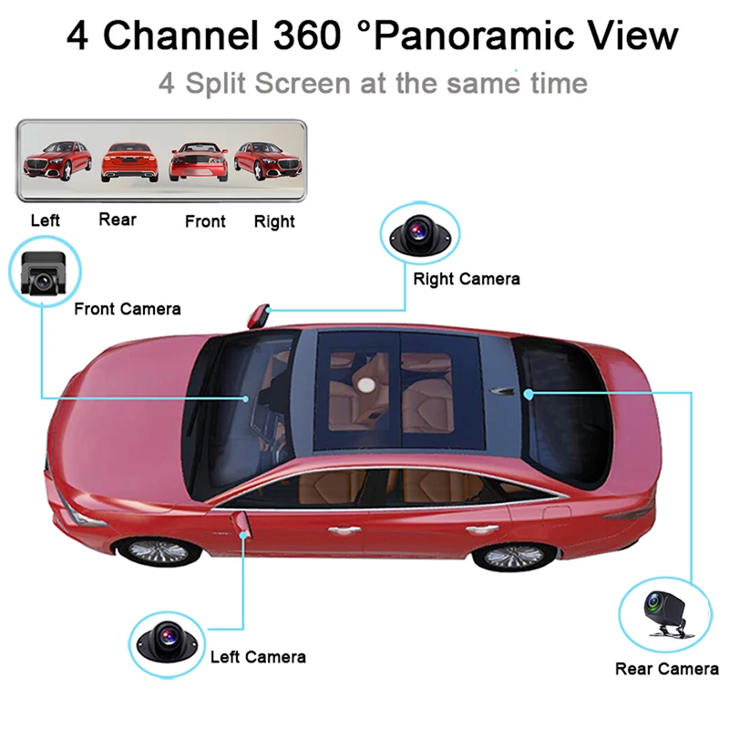 Запись фронтальной и задней камеры одновременно. Камера с правой и левой глубиной для отображения изображения для безопасной парковки. Объектив фронтальной камеры 1080P, а задняя камера 1080P для записи видео; Правая и левая камера 1080P.Фронтальная камера: FHD1080P,150 °-170 °Задняя камера: SONY IMX323 1080P ,140 °Левая/правая Камера: 1080P