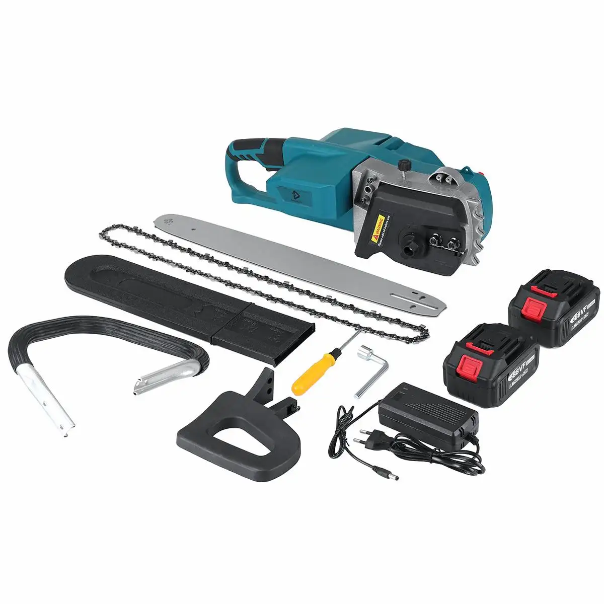 Посылка включает в себя:2 типа батареи:1x электрическая пила1x цепь1х перегородка1x ручка2x аккумулятор1 направляющая пластина1x Руководство пользователя на английском языке2x инструмент для установки1x ящик для хранения (направляющая пластина)1x зарядное устройство(1х штепсельный адаптер, в соответствии с вашей страной доставки)