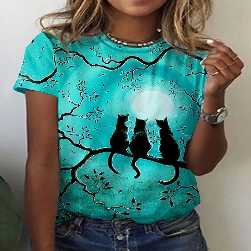 Новинка 2021, художественная футболка с 3D-принтом животного, кота, летняя повседневная модная свободная футболка с коротким рукавом, одежда