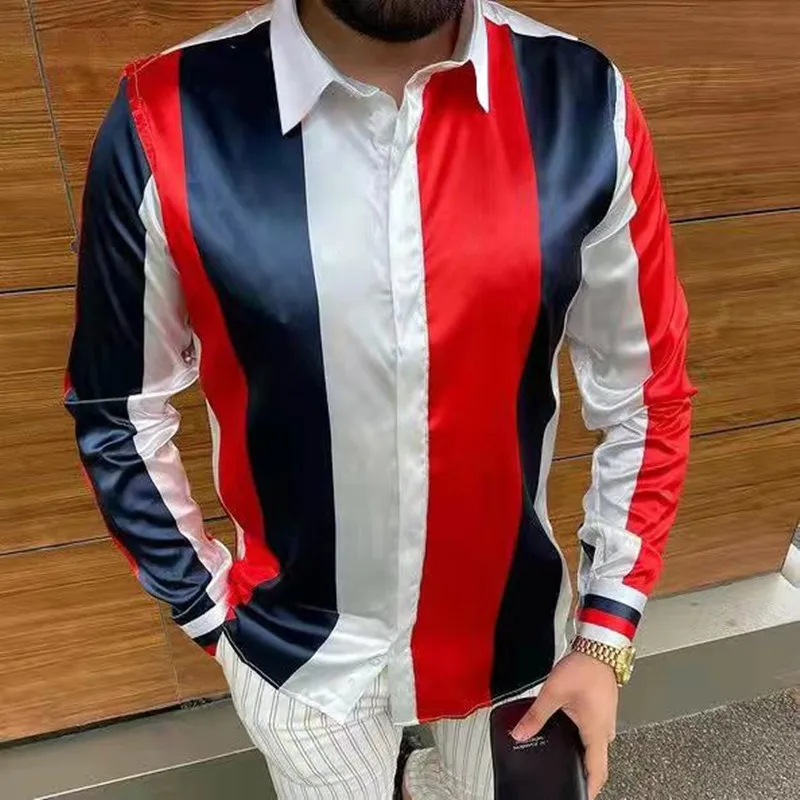 Мужская атласная рубашка в полоску, повседневная приталенная рубашк...