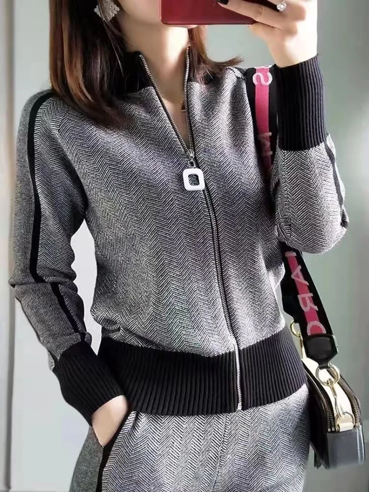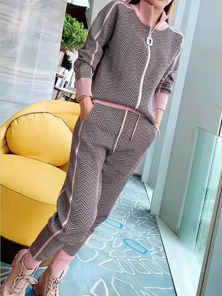 Модные спортивные штаны для бега на осень и зиму, Женский вязаный спортивный костюм для отдыха, женский свитер из двух предметов, пальто, Стрейчевые брюки