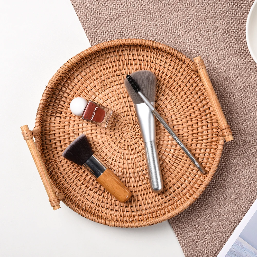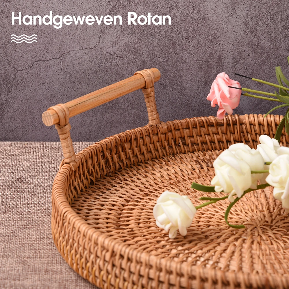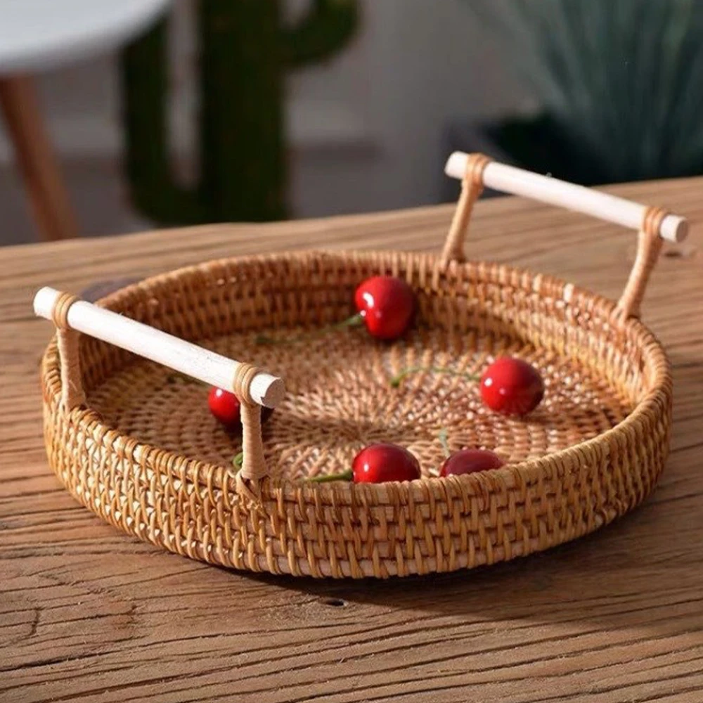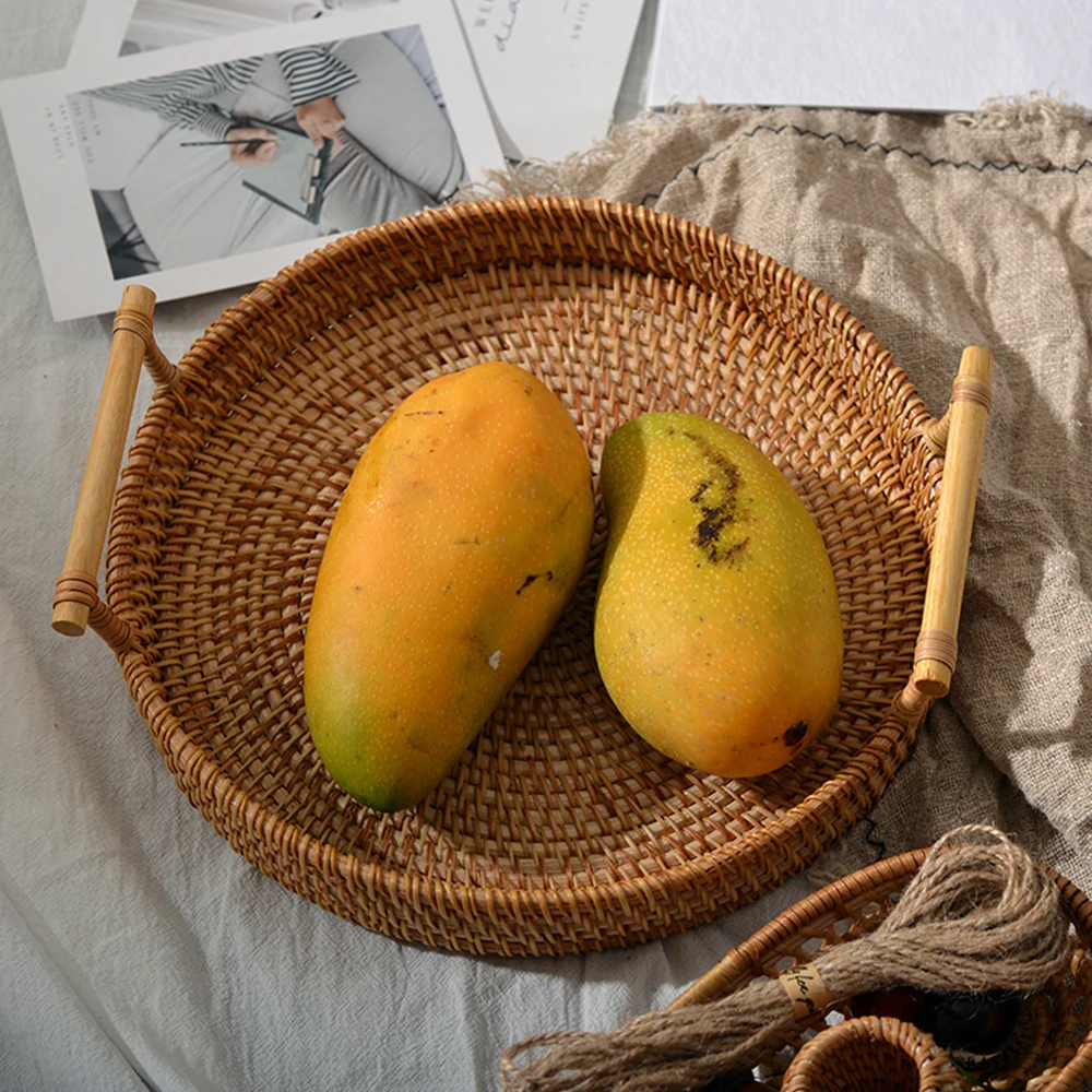 Плетеный Круглый поднос из ротанга ручной работы, деревянная тарелка для хранения продуктов, с деревянными ручками, плетеная корзина для фруктов, макетная корзина, 22 см