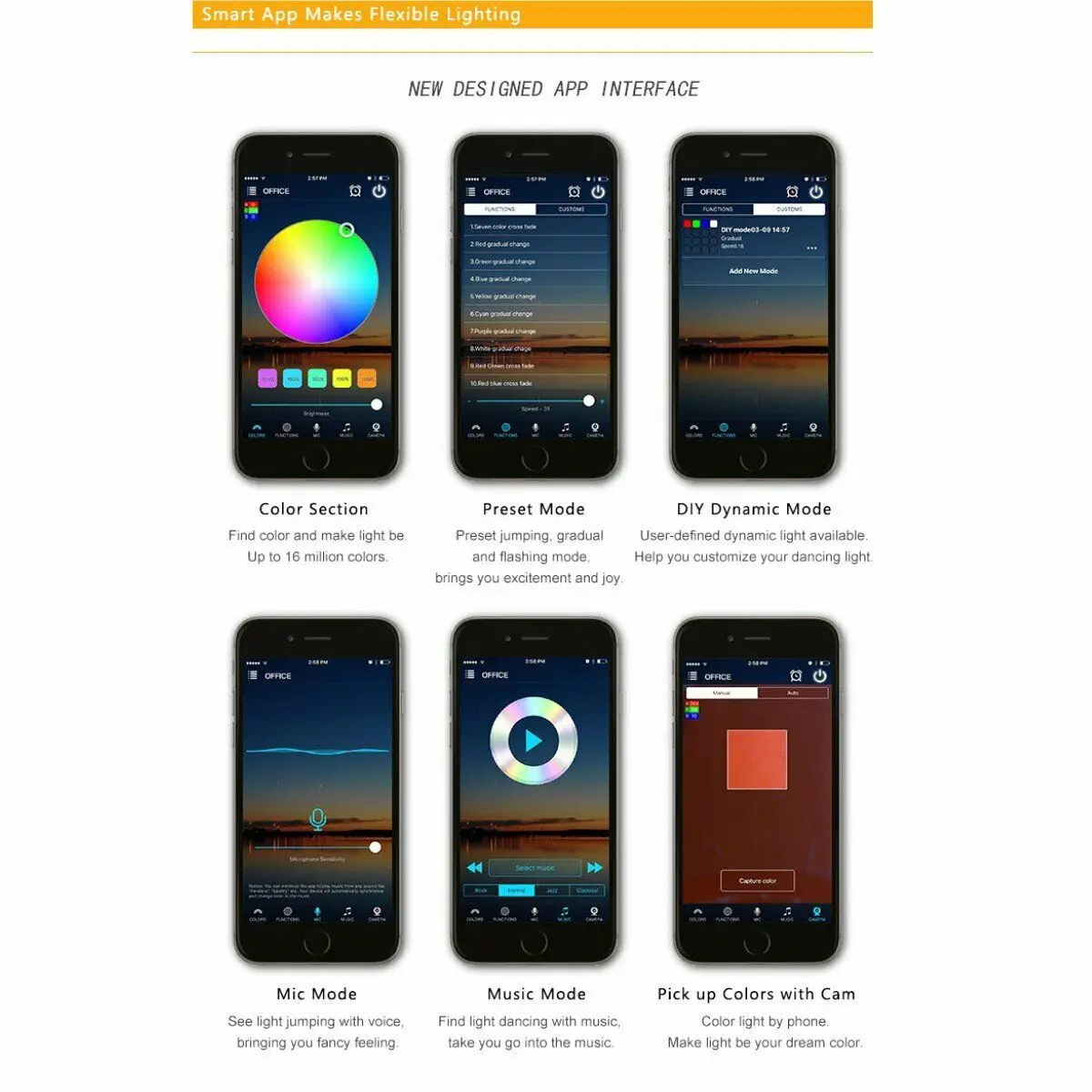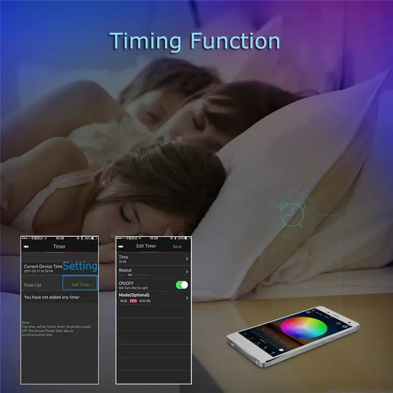 10. Несколько функций: 16 миллионов цветов/Управление смартфоном/Синхронизация с помощью группы/пользовательский режим/Режим таймера Kickstart ваши вечерние/светильник танцы с музыкой/сохранить любимые цвета/дистанционное управление через Интернет