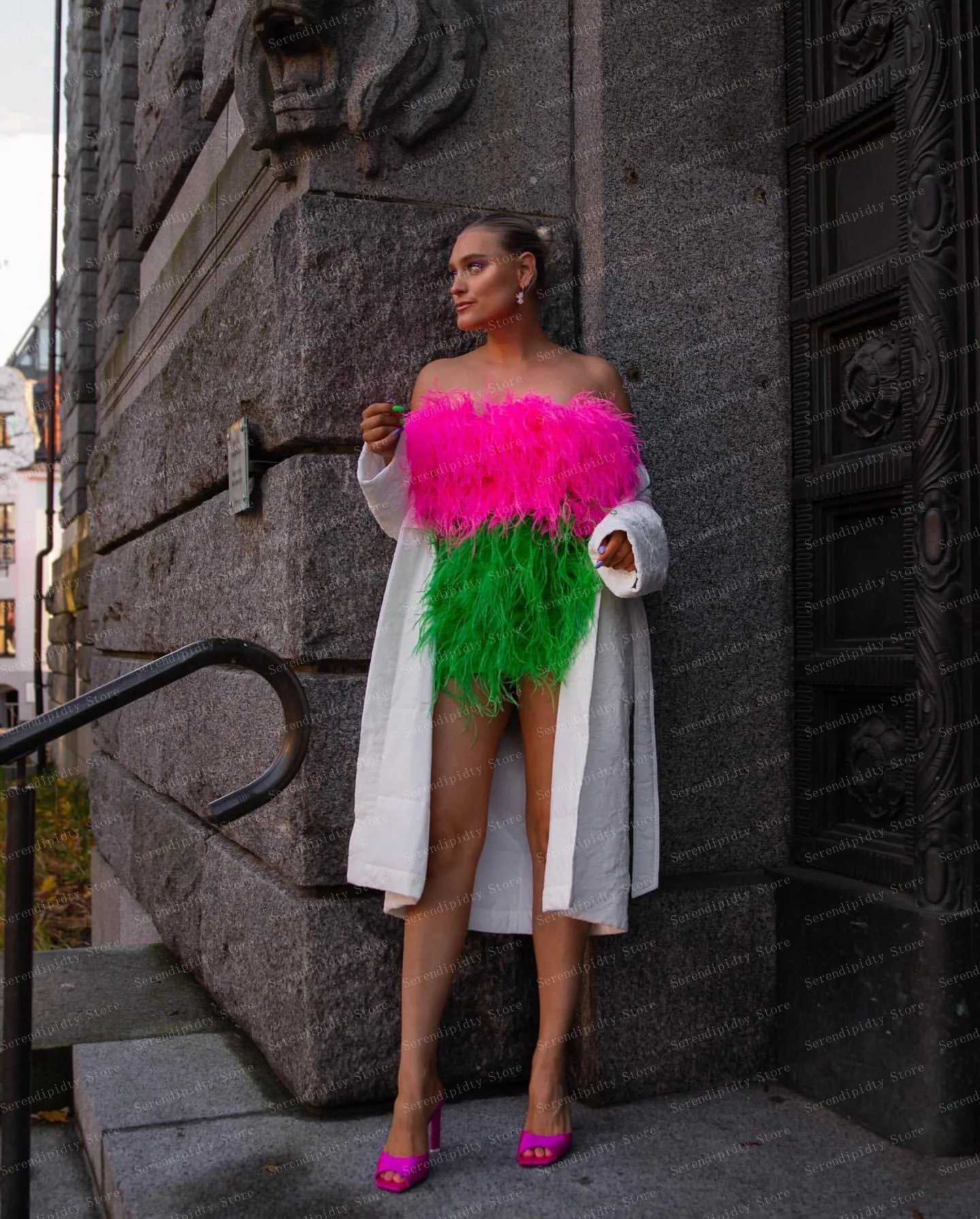 Женское платье с перьями, контрастное платье, розовые и зеленые платья для женщин, мини-платье, женская одежда, облегающее платье с перьями
