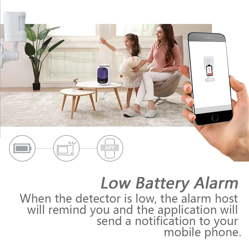Когда напряжение датчика низкое, датчик отправит сигнал на Хост сигнализации, и Хост сигнализации напомнит об использовании этого датчика, что батарея низкая, (Хост сигнализации также должен иметь функцию напоминания о низком заряде батареи)