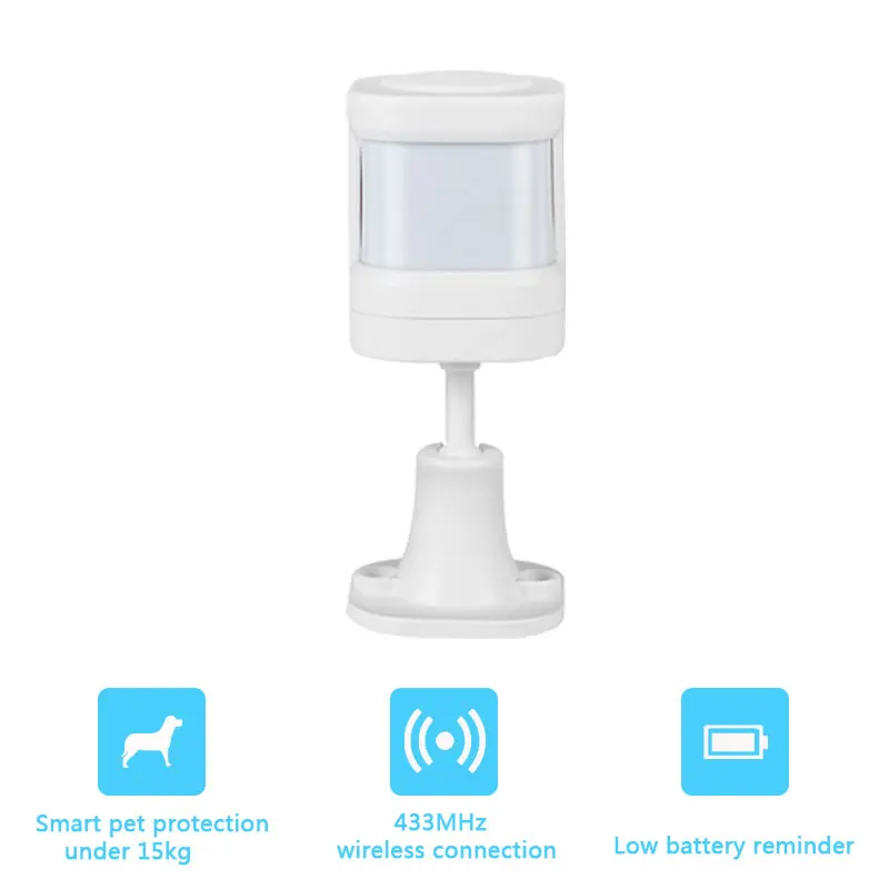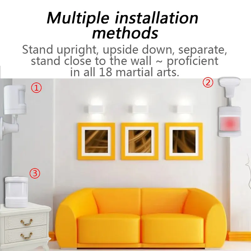 Инфракрасный датчик имеет иммунную функцию для домашних животных до 15 кг, уменьшая вероятность запуска домашних животных датчик домаДатчик может быть отрегулирован на 360 ° влево и вправо, и на 90 ° вверх и вниз, что может удовлетворить все потребности установки