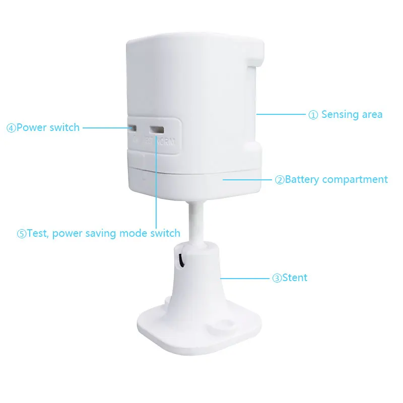 Инфракрасный датчик может быть установлен в домах, больницах, офисах, магазинах, школах и т. д. он подключен к хосту сигнализации 433 МГц и не может использоваться отдельно. Пока срабатывает инфракрасный датчик, Хост сигнализации может издавать звук сирены