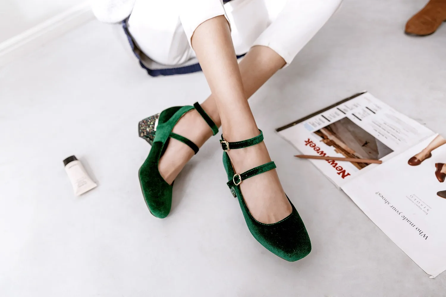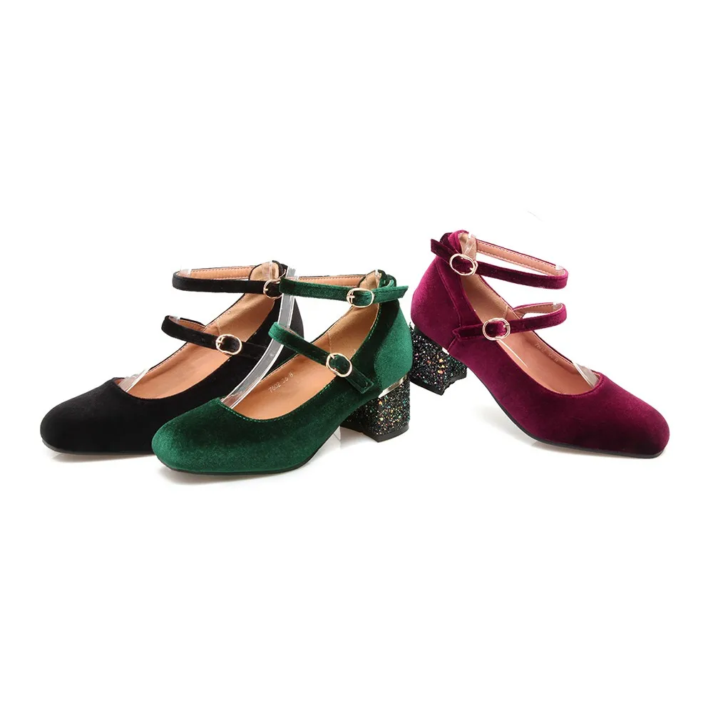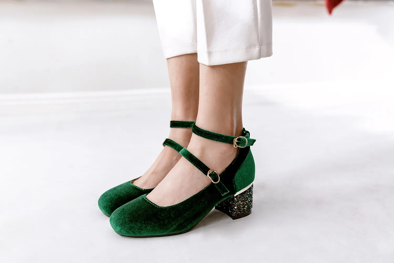 Женские туфли-лодочки из флока, зеленые однотонные туфли на квадратном каблуке 5 см с блестками и ремешком на щиколотке, размер 45, весна 2022