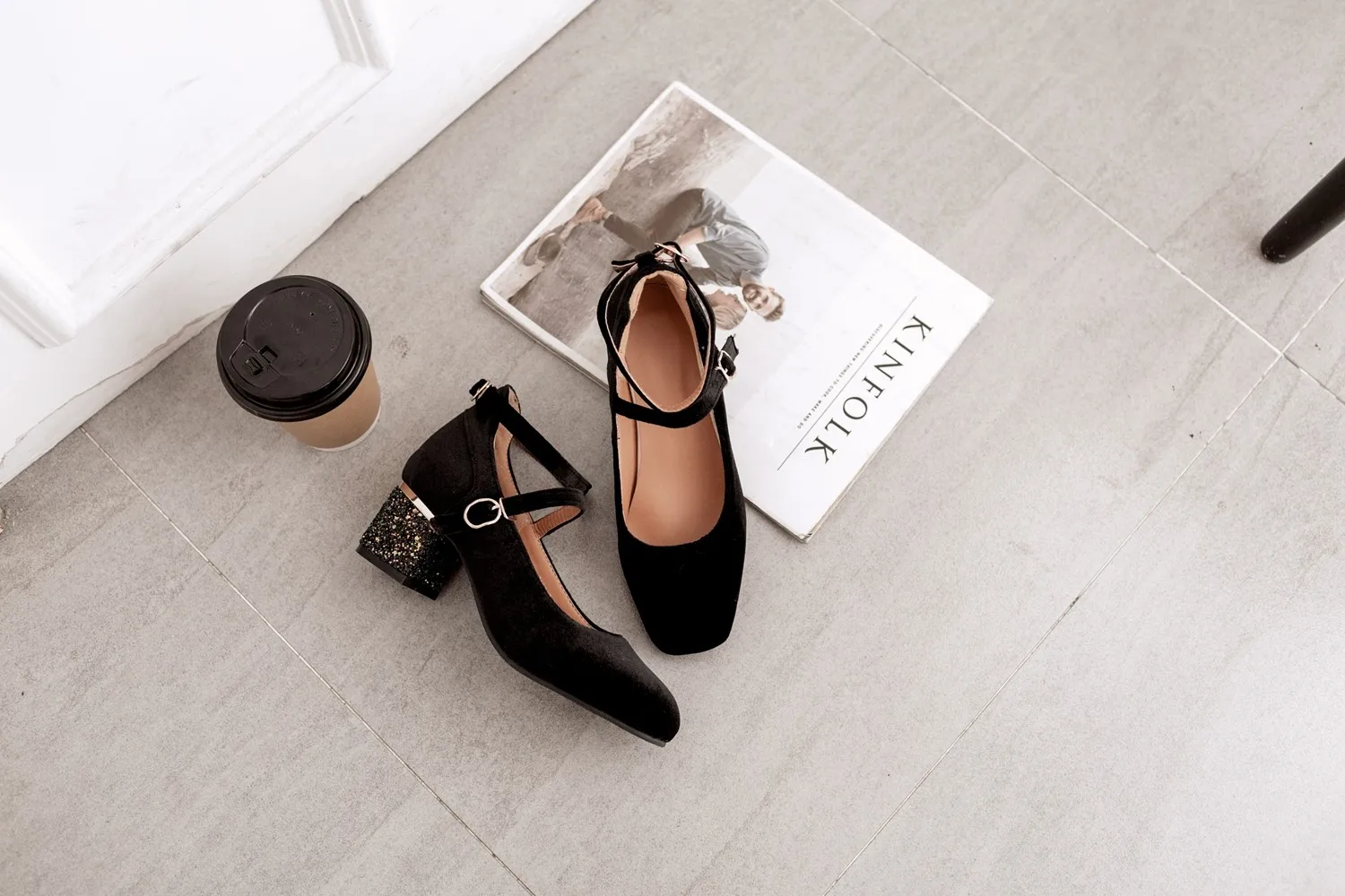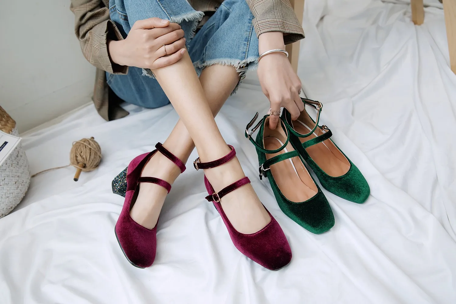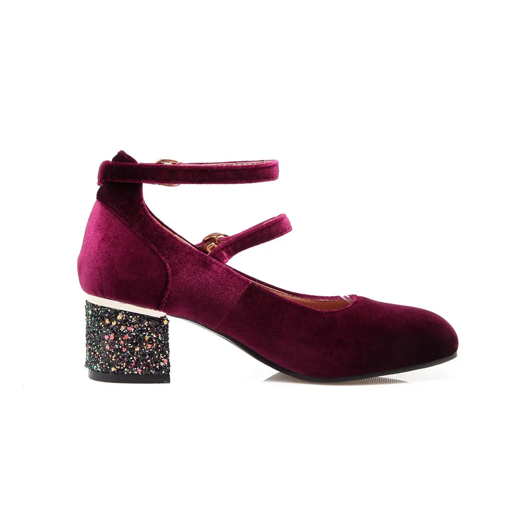 Женские туфли-лодочки из флока, зеленые однотонные туфли на квадратном каблуке 5 см с блестками и ремешком на щиколотке, размер 45, весна 2022