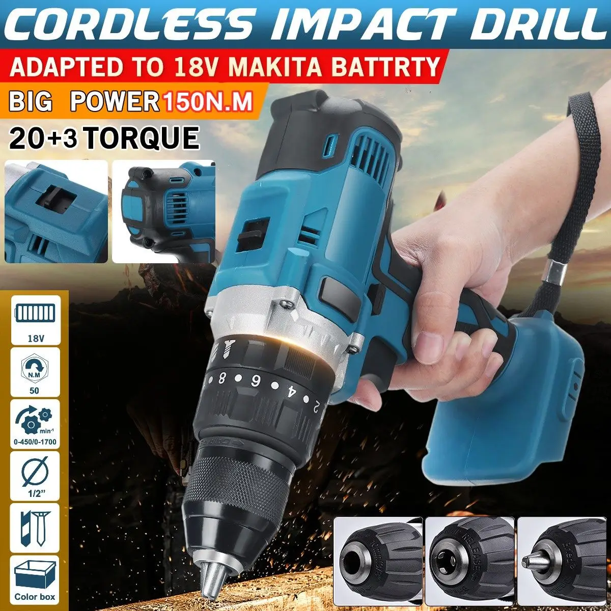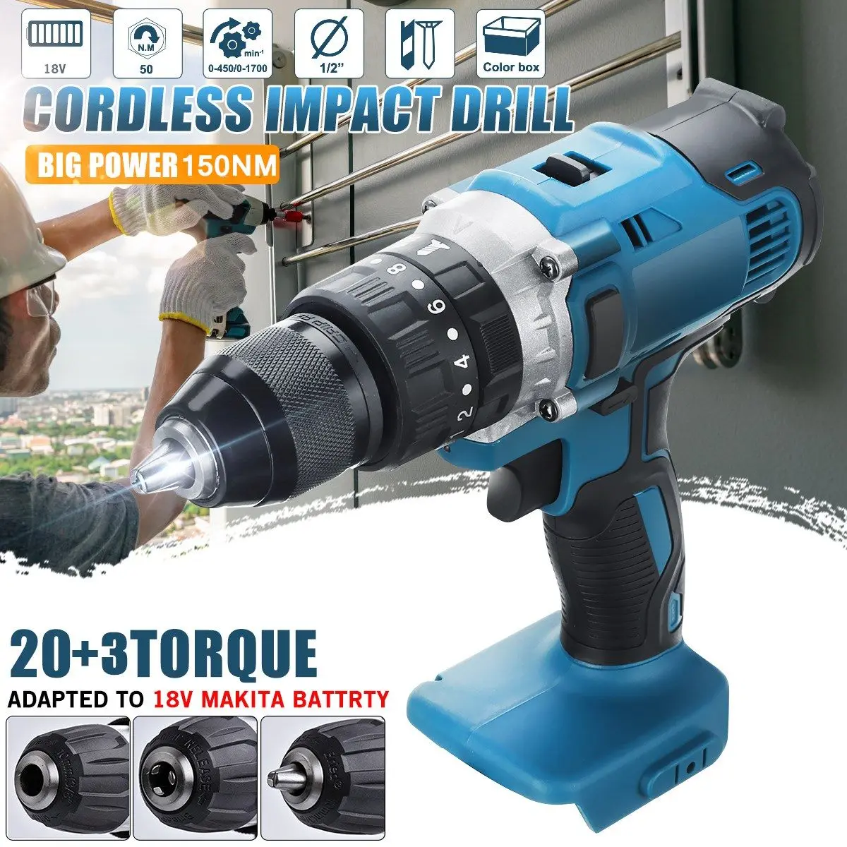 Название: беспроводная ударная дрельТехнические характеристикиАдаптирован для Makita 18V батарея.Цвет: синий + черныйМаксимальный крутящий момент: 150 нмРазмер патрона: 13 ммФункция плоского сверла/функция молотка/функция отвертки 3 в 1